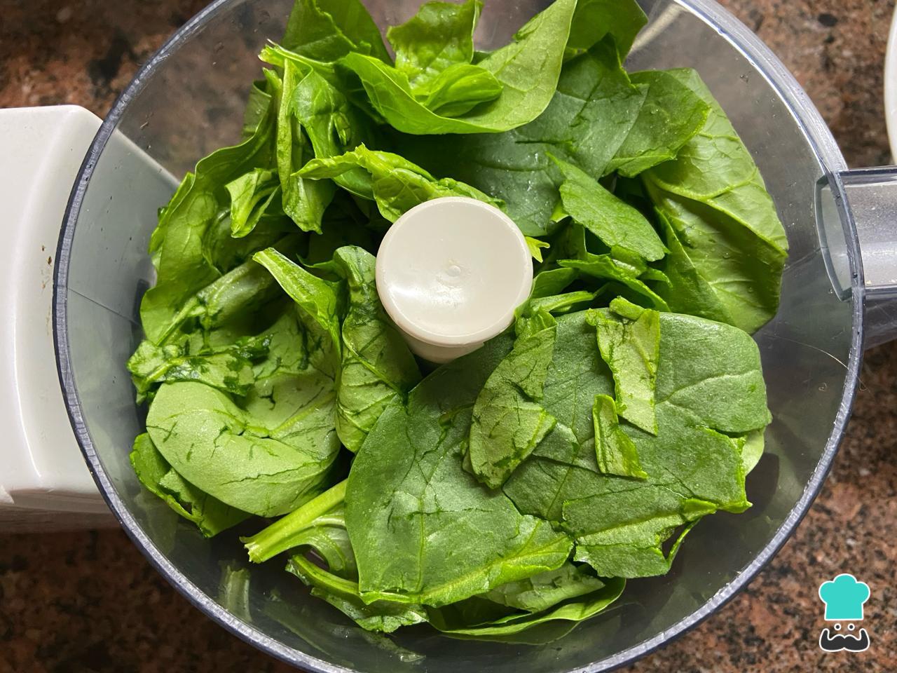 Lava muy bien las hojas de la acelga y la espinaca. Luego, escúrrelas o sécalas y pícalas en una procesadora.