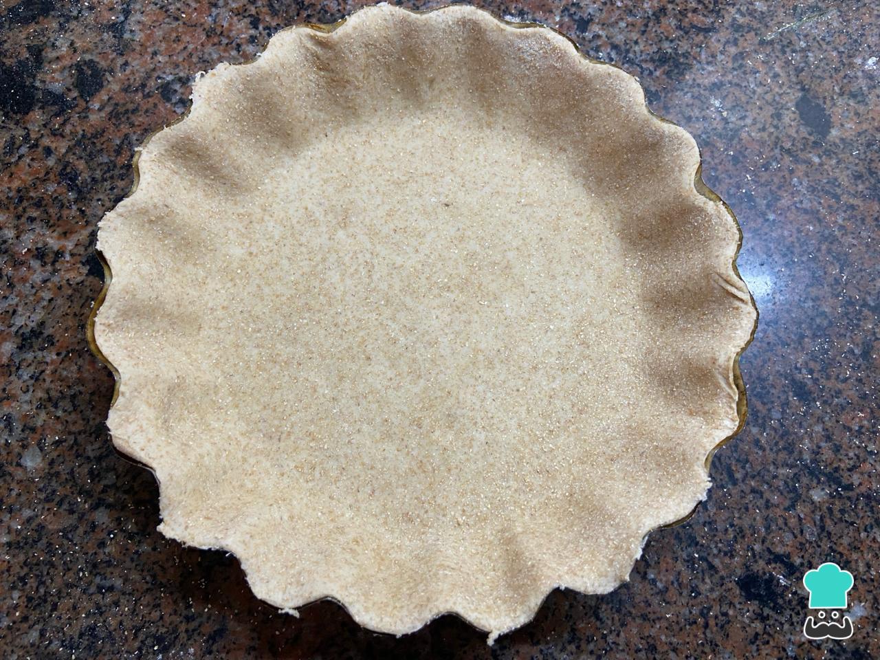 Enciende el horno para precalentarlo a 200 °C. Mientras tanto, estira la masa con un palote y cubre el molde.