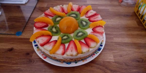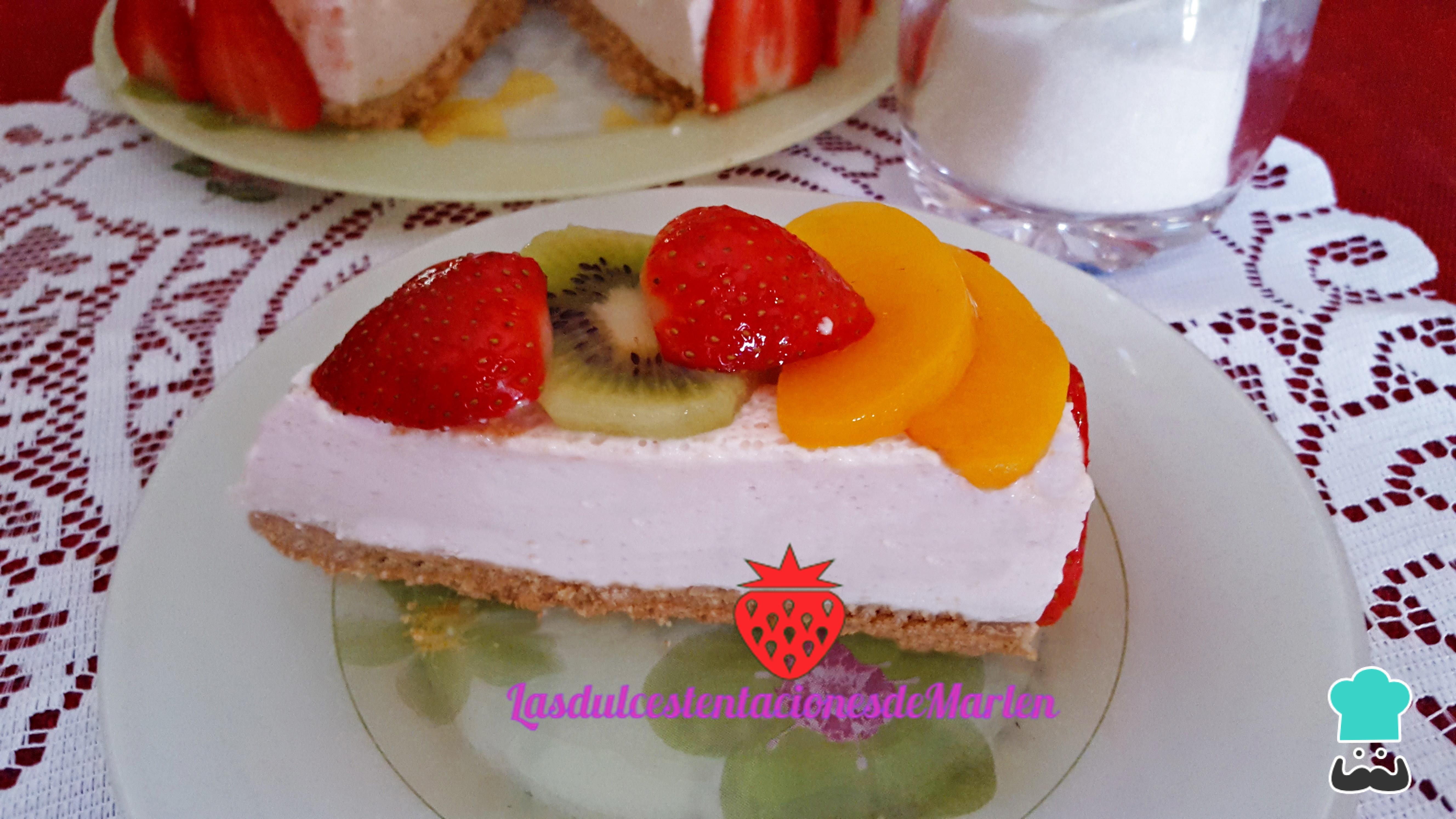 Sigue leyendo y descubre en RecetasGratis el paso a paso para aprender a preparar esta tarta de frutas frescas o en almíbar, con un relleno de yogur y una base de galletas que dará como resultado un postre fácil e ideal para cualquier ocasión. Anímate, prepara esta increíble tarta de frutas sin horno y deja tu comentario valorando la receta.
