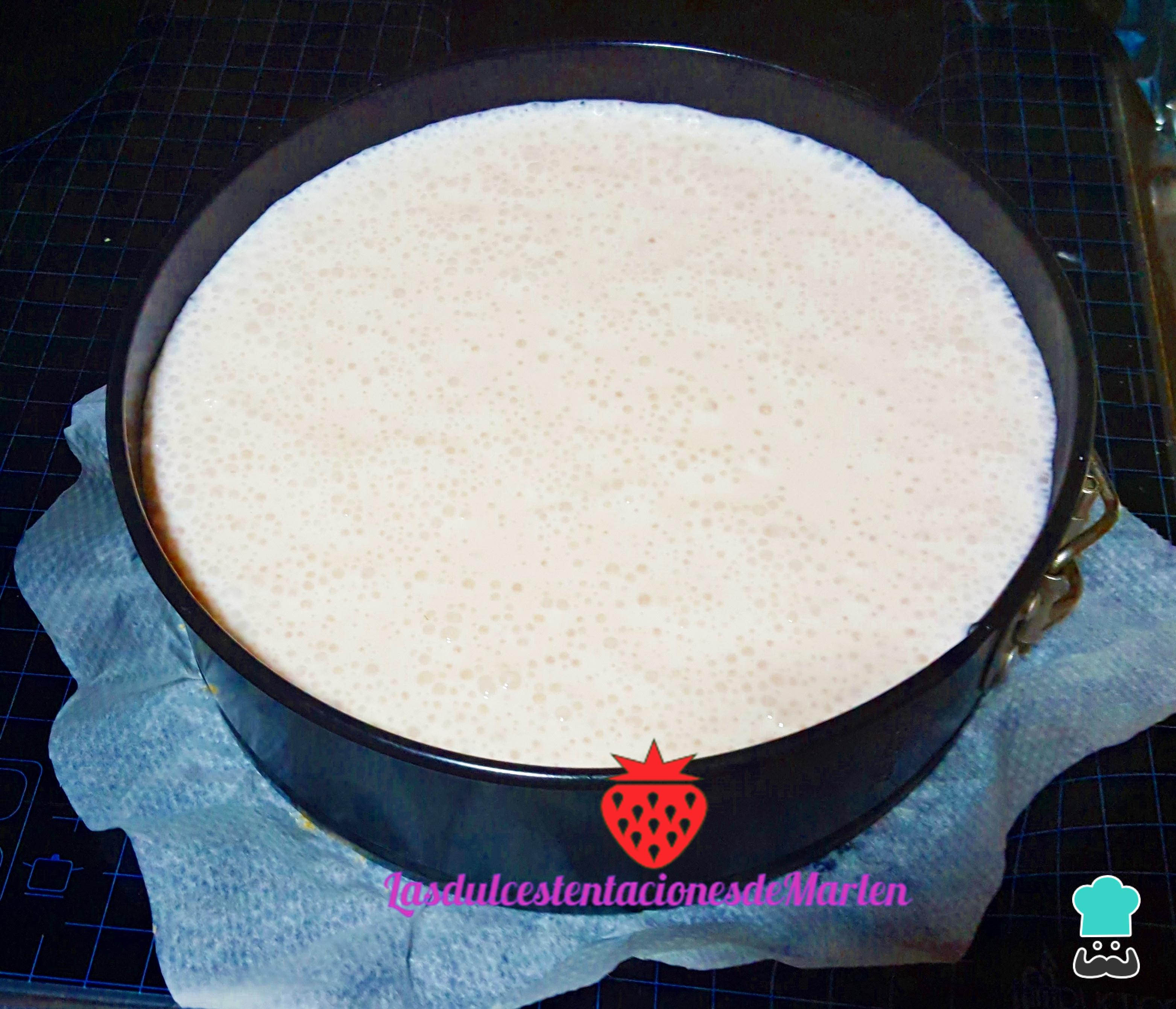 Para realizar esta tarta fría de frutas sin horno yo he optado por un molde de 20 cm de diámetro desmontable, y he colocado en la base del mismo una lámina de papel vegetal para evitar que se pegue. Hecho esto, empezamos la receta por la preparación de la base de galletas. Para ello, trituramos las galletas tipo María y las mezclamos con la mantequilla fundida hasta formar una mezcla arenosa. Luego, colocamos la pasta en el molde y la distribuimos de forma uniforme por el fondo. Reservamos en el frigorífico durante media hora.