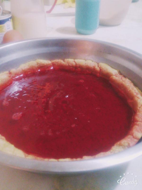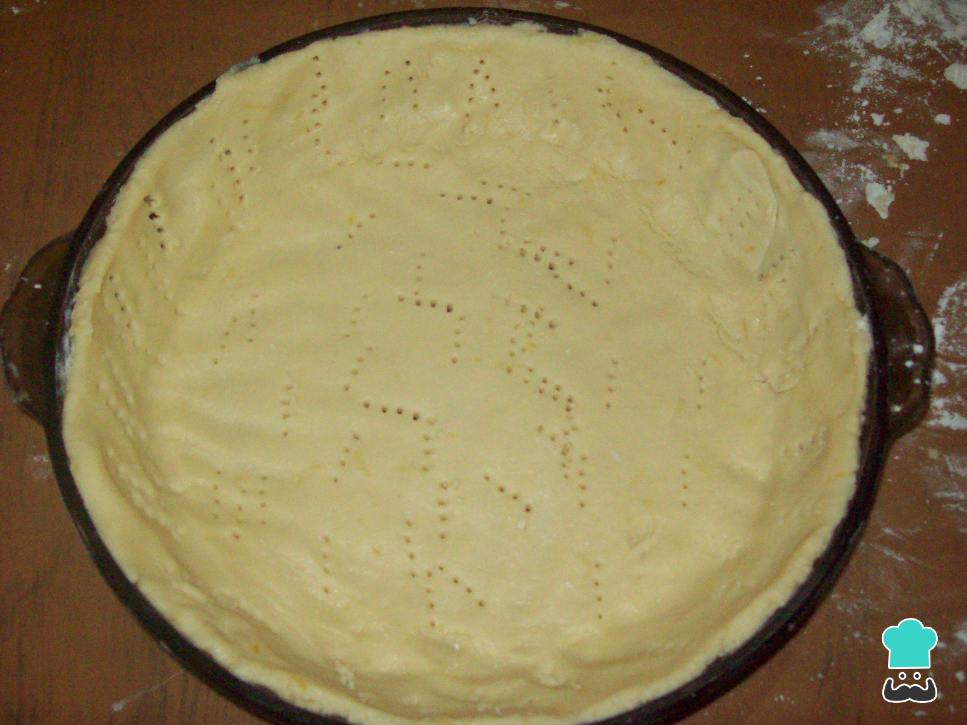 Acomodar la masa de la tarta de gelatina de fresa sobre un molde para tartas, previamente enmantecado y extenderla tanto en la base como a los costados. Pinchar para evitar que la masa se infle durante la cocción y llevar a horno previamente calentado en 180º C durante aproximadamente 30 minutos.
