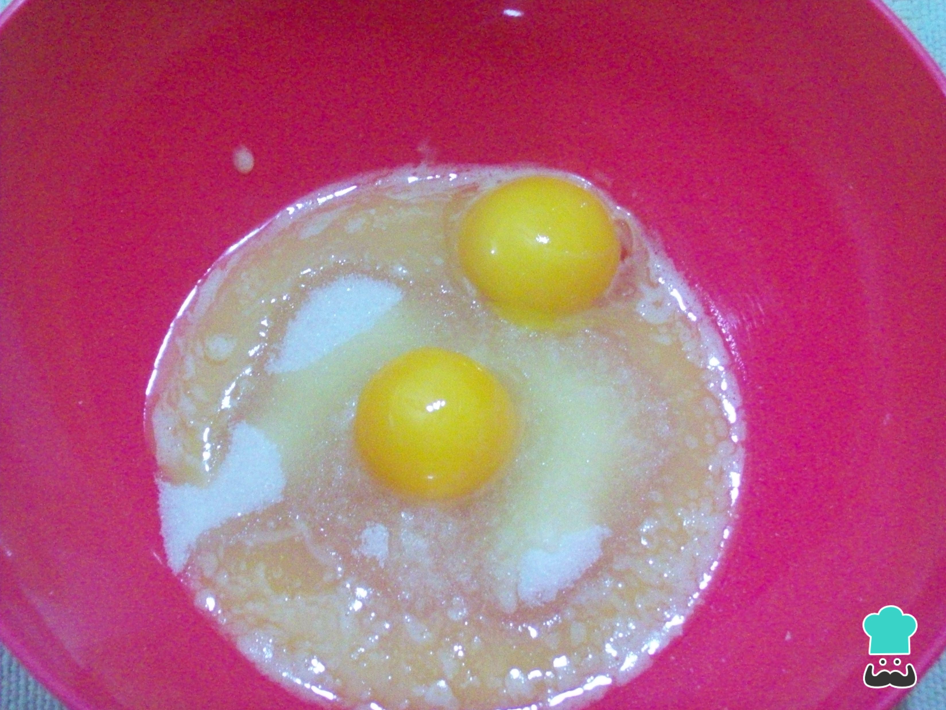 Para realizar esta sabrosa tarta de gelatina de fresa, vamos a comenzar por verter en un bol la manteca (previamente derretida), las yemas, y el azúcar. Batir durante 3 minutos hasta integrar ingredientes y obtener la consistencia similar a la de una crema.