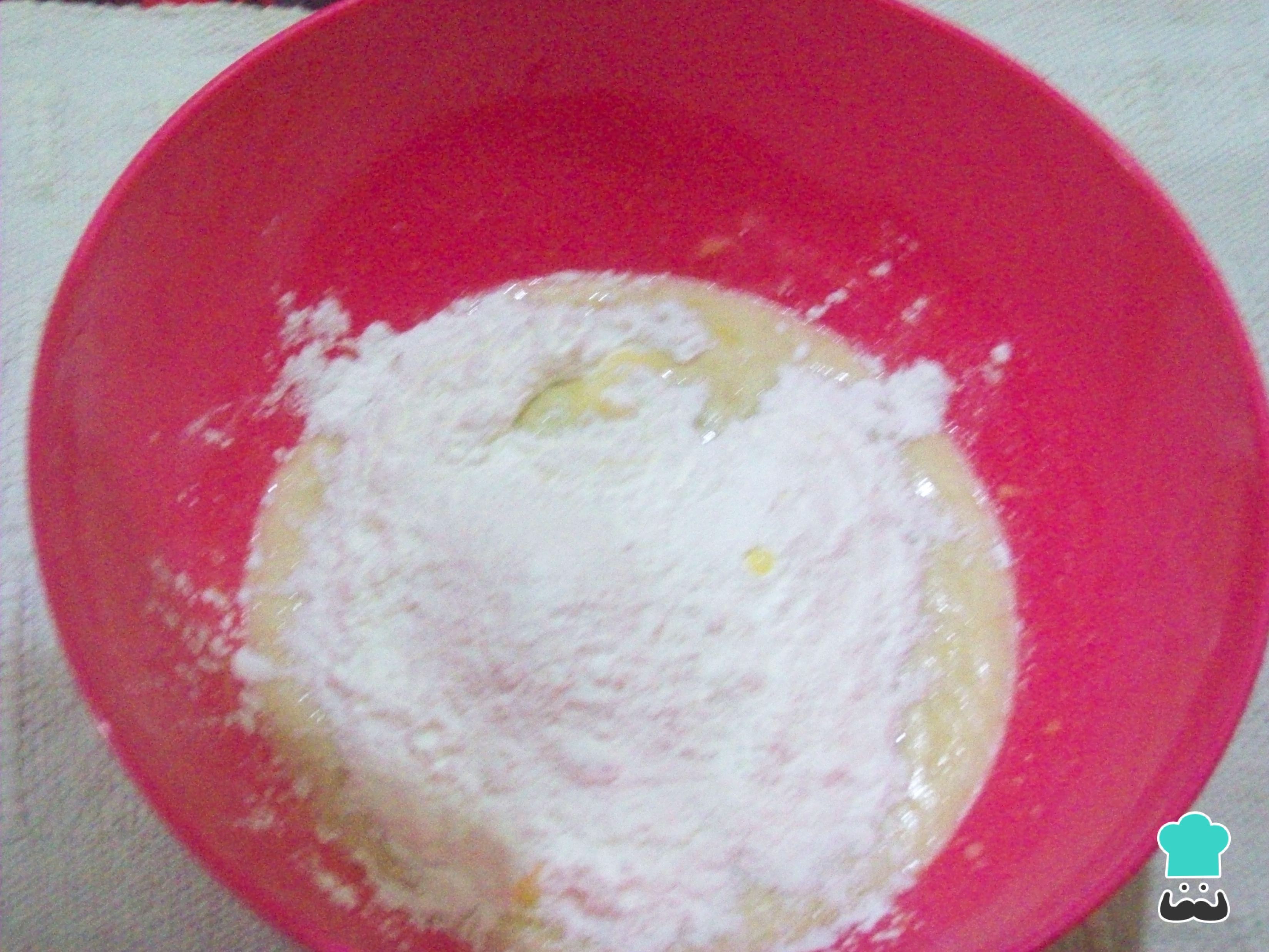 Agregar la harina y la maicena. Mezclar con un batidor o tenedor e ir formando la masa de la tarta. Al principio lucirá algo desgranada, pero seguir mezclando hasta moldear la masa de la tarta de gelatina de fresa.