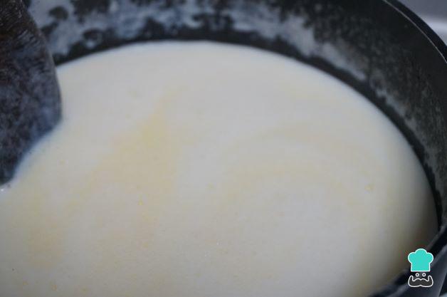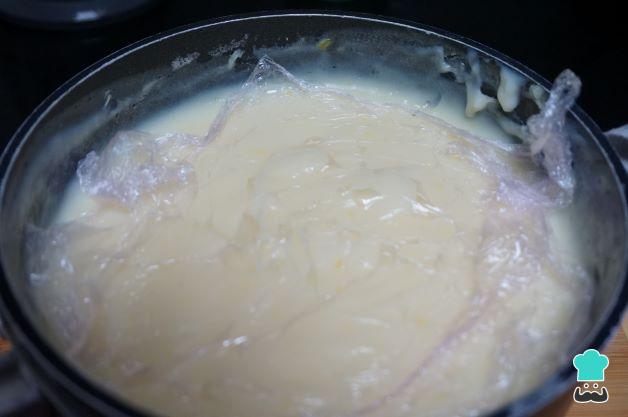 Cuando hierva la leche, retírala del fuego. Añade un poco de la leche a la mezcla de los huevos y remueve enseguida para que no se cuajen los huevos. Echa esta mezcla al cazo de la leche y remueve sin parar en el fuego medio hasta que empiece a espesar la crema. Cuando observes que está espesa y empieza a hervir, retira la crema y tápala con papel film hasta la hora de utilizarla.