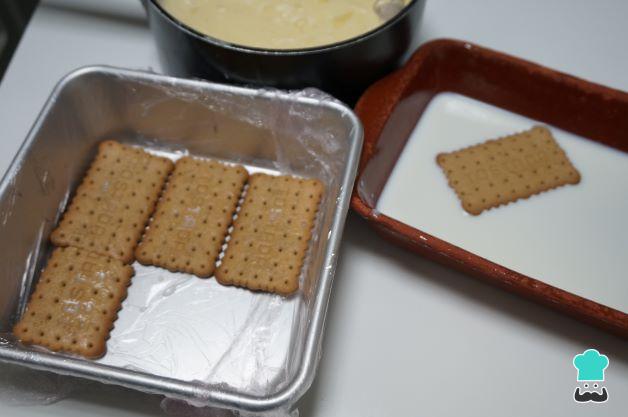Coge un molde desmontable y prepara las galletas. A continuación, añade la leche que hemos reservado en un recipiente y ve mojando las galletas en la leche añadiendo en la base del molde.