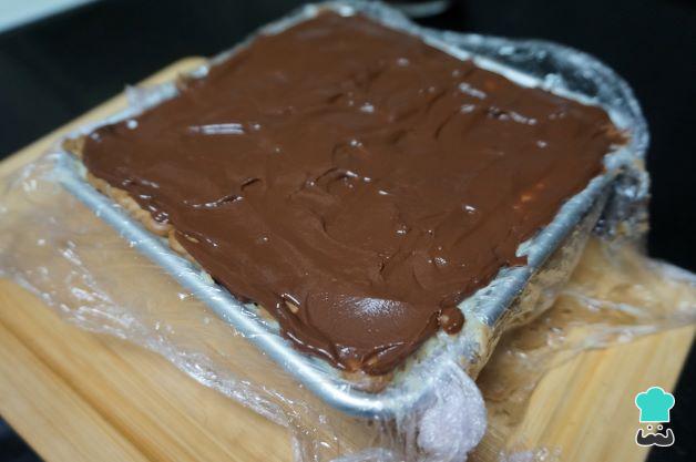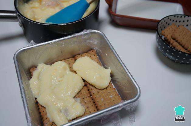 Añade encima de las galletas una capa de la crema, sigue con otra de galletas y otra de crema, la última debe ser de galletas. Reserva en la nevera la tarta de galletas de la abuela de toda la vida.