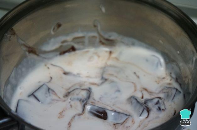 Prepara el chocolate. Añade la nata o crema de leche al fuego con el chocolate yremueve hasta que el chocolate esté desecho, con cuidado que no se queme.