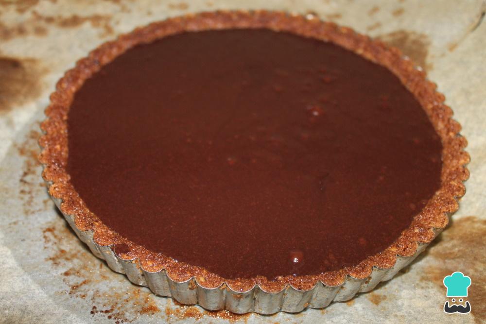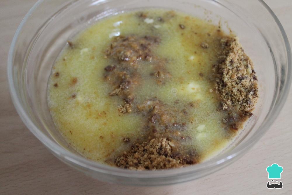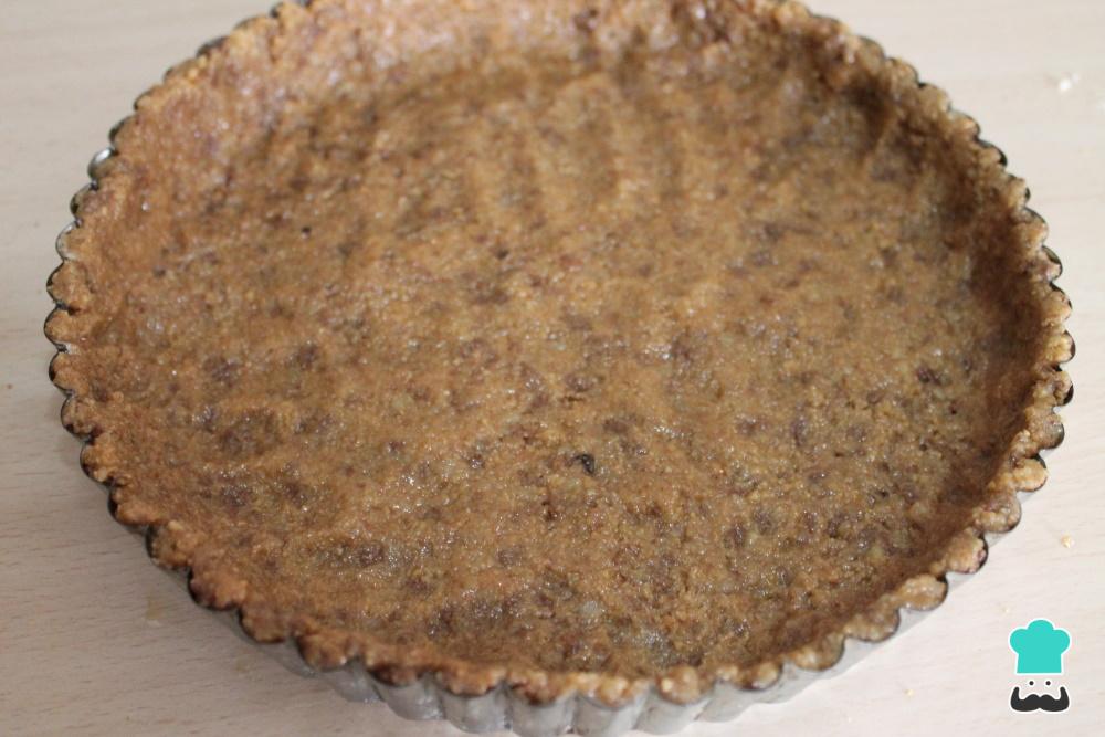 Engrasa un molde preferiblemente desmontable de unos 20 cm de diámetro con mantequilla fundida o con un espray desmoldante. Forra toda la base del molde con la masa de galletas y mantequilla. Si el molde es de paredes bajas, tipo tartaleta, forra también las paredes. Hornea la base durante 10 minutos en el horno precalentado a 180 ºC con calor arriba y abajo. Retírala del horno para proceder con el relleno.
