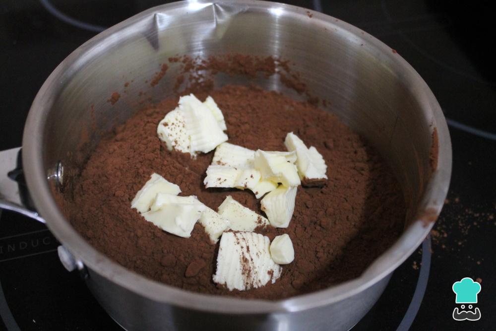 Introduce en un cazo la leche condensada, el cacao y la mantequilla troceada y caliéntalo a fuego suave. Ve removiendo con unas varillas hasta que la mantequilla se funda y quede una crema homogénea.