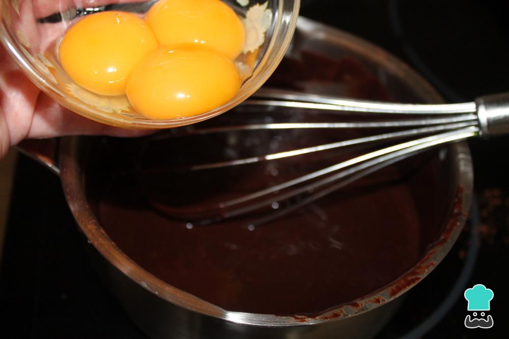 Retira la crema de leche condensada y cacao del fuego y añade las yemas de huevo una a una mientras las mezclas con unas varillas. Las claras sobrantes puedes guardarlas para otra receta o elaborar un sencillo merengue suizo para decorar esta tarta de leche condensada y chocolate.