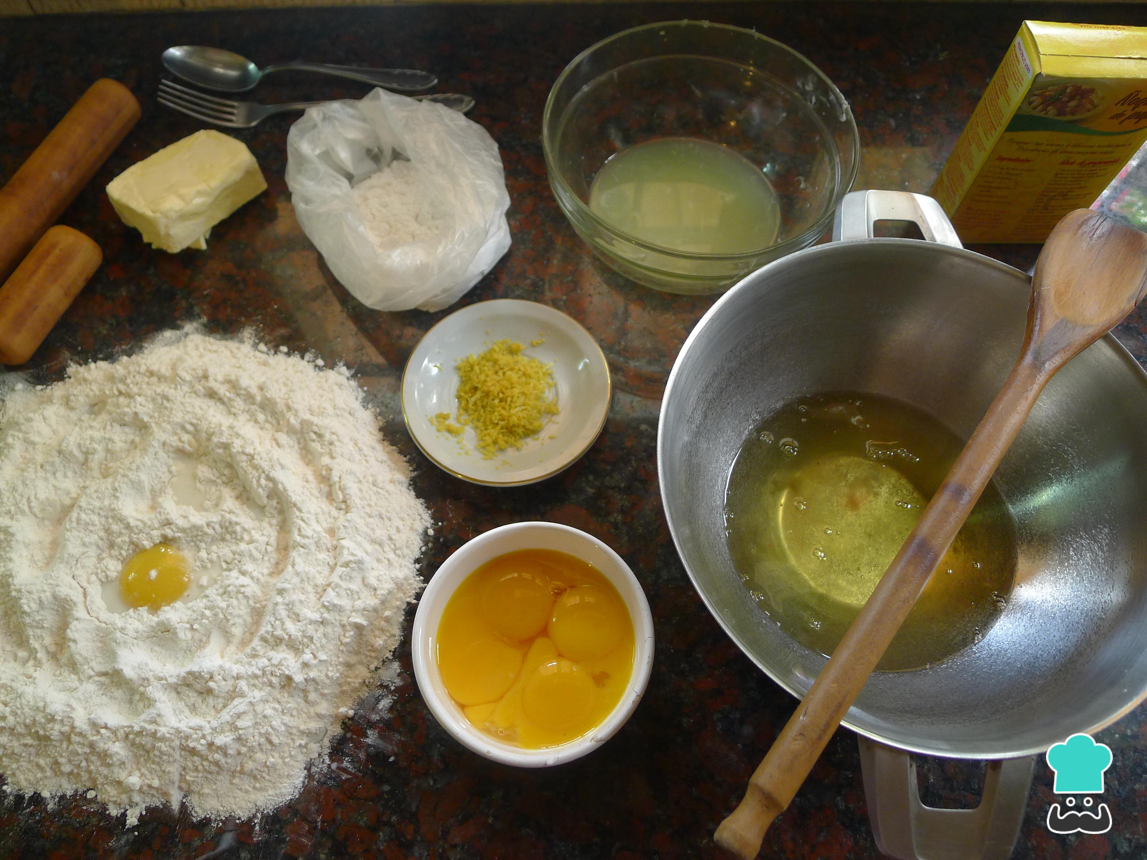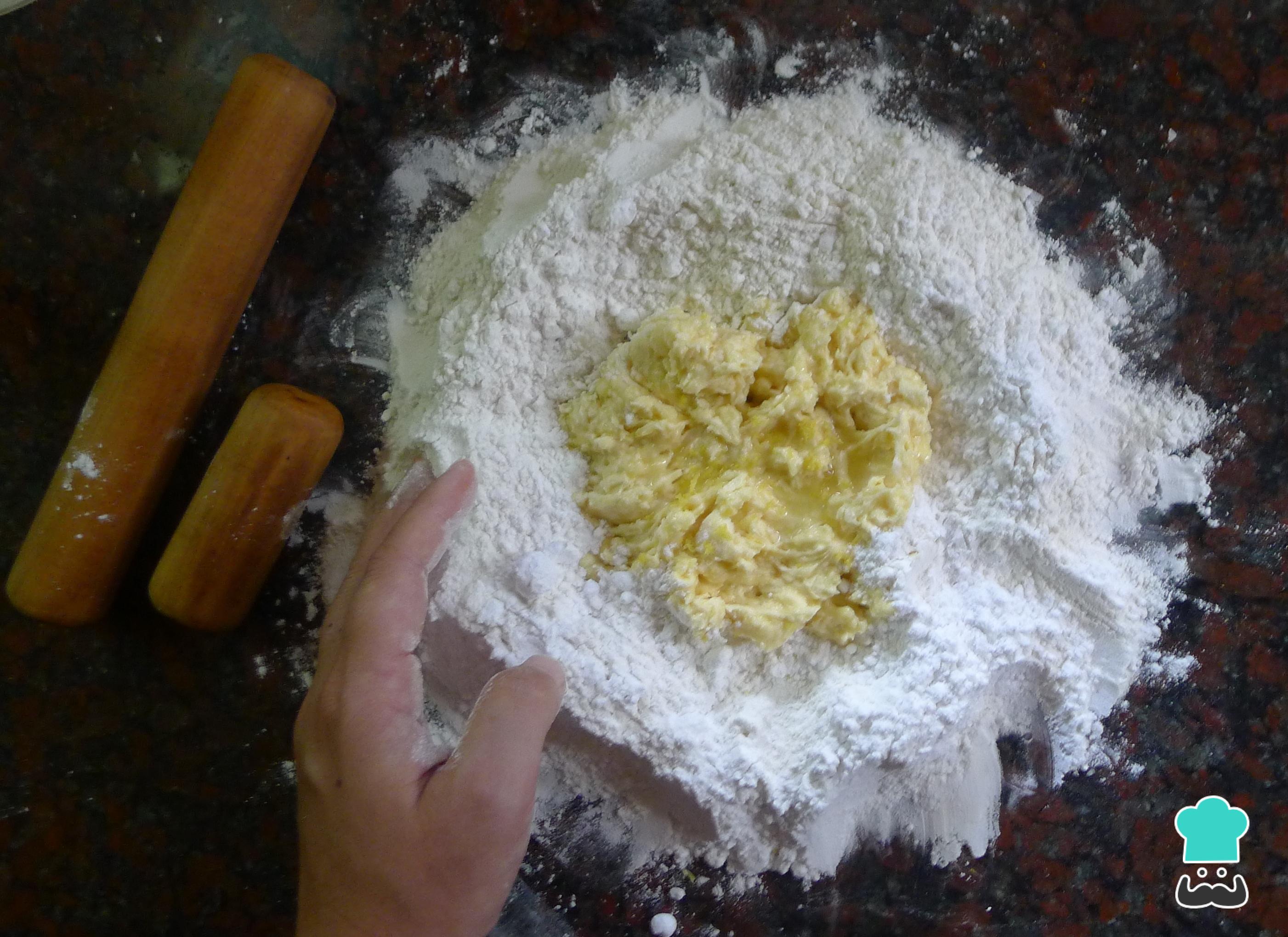 Para hacer la masa, forma un volcán con la harina y coloca en el centro la mantequilla a temperatura ambiente, el azúcar, las yemas y la ralladura de limón. Mezcla y amasa hasta formar una masa homogénea. Luego, deja que repose en la nevera unos 20 minutos.