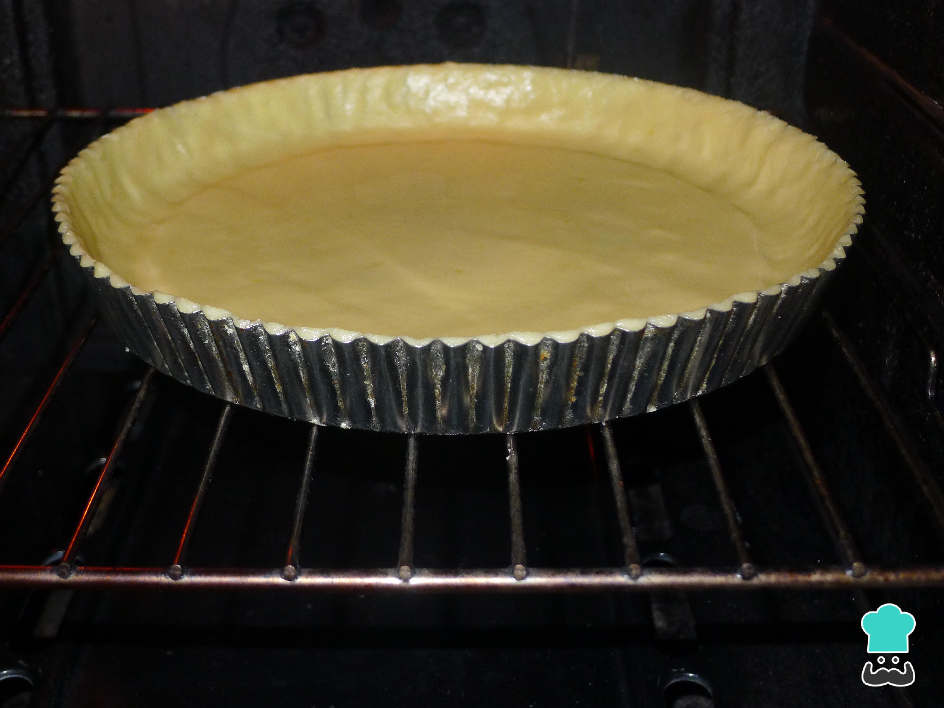 Precalienta el horno a 180 ºC. Mientras tanto, engrasa un molde de 26 cm de diámetro, estira y coloca la masa en la base. Para evitar que leve, coloca algo de peso encima, como por ejemplo garbanzos, y hornea la masa durante 20-25 minutos, o hasta que esté dorada. Retírala del horno y reserva para seguir con la tarta de limón con merengue.