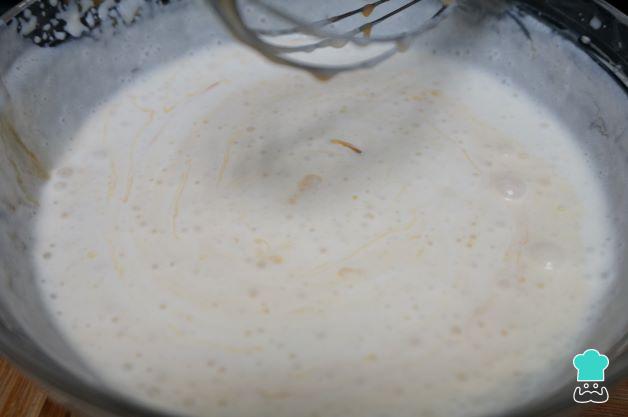 Añade un bol con la nata y bate hasta que esté medio montada, añade la cuchara de vainilla y la leche condensada. Vuelve a mezclar.