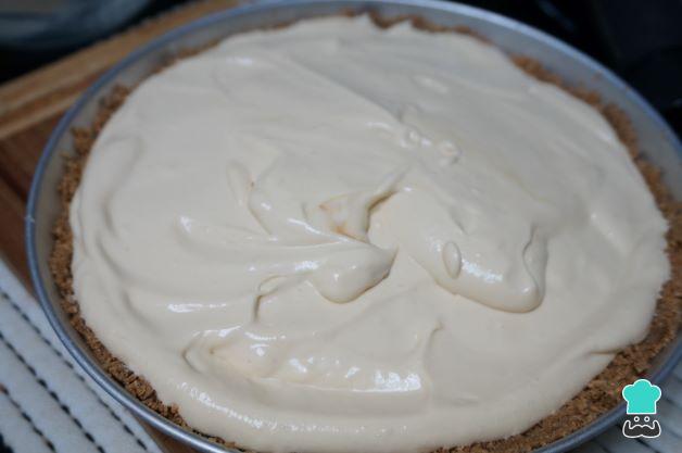 Retira el molde de las galletas de la nevera, rellena la tarta con la crema de limón. Con una espátula alisa la superficie de la tarta para que quede lisa.