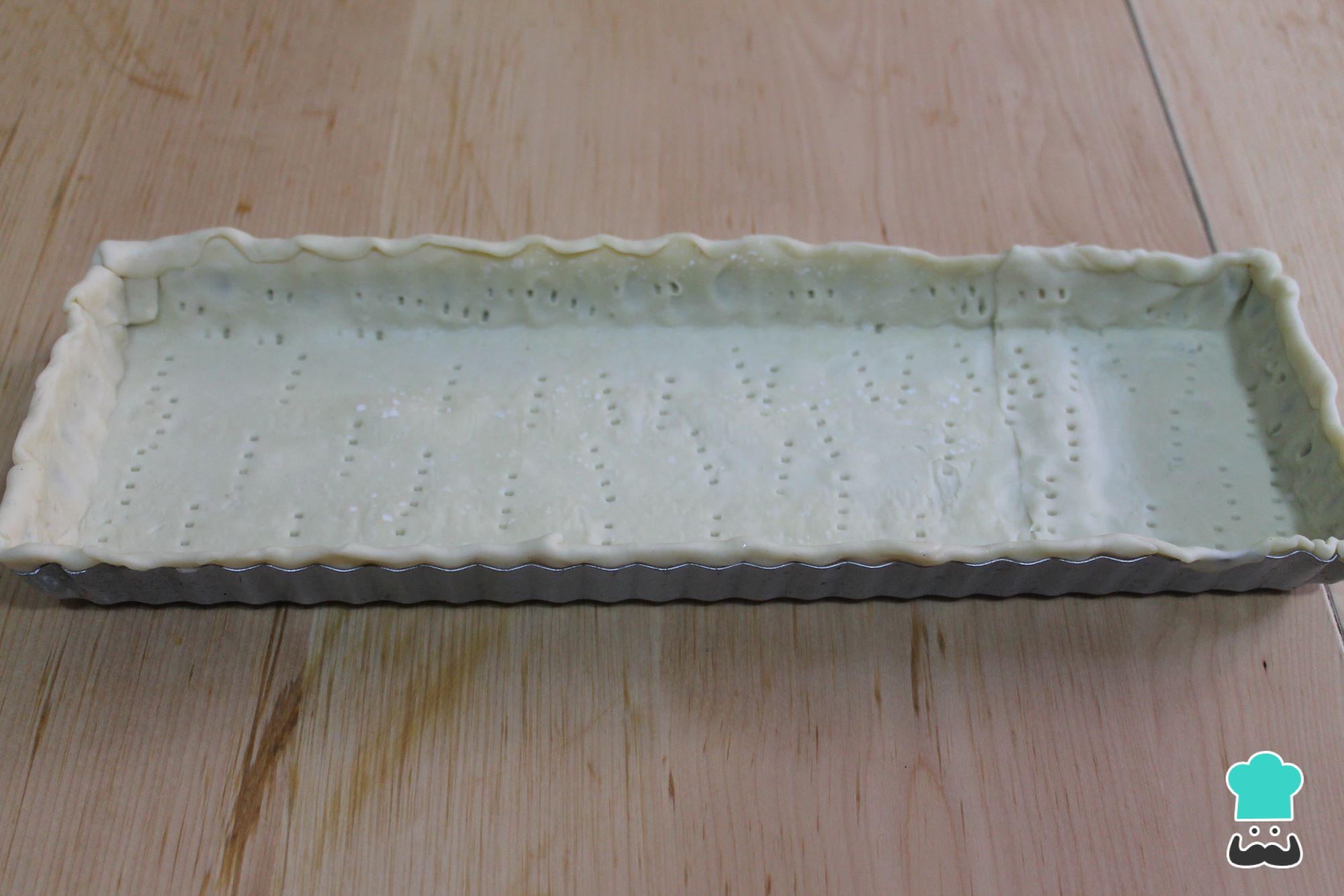 Engrasa bien el molde que vayas a utilizar, preferiblemente que sea rectangular, y acomoda la masa de hojaldre en él. Recorta los bordes de hojaldre si sobran o si es poca cantidad los puedes doblar hacia dentro. Pincha toda la superficie y los bordes del hojaldre con un tenedor, cubre con un paño de cocina y reserva en la nevera.