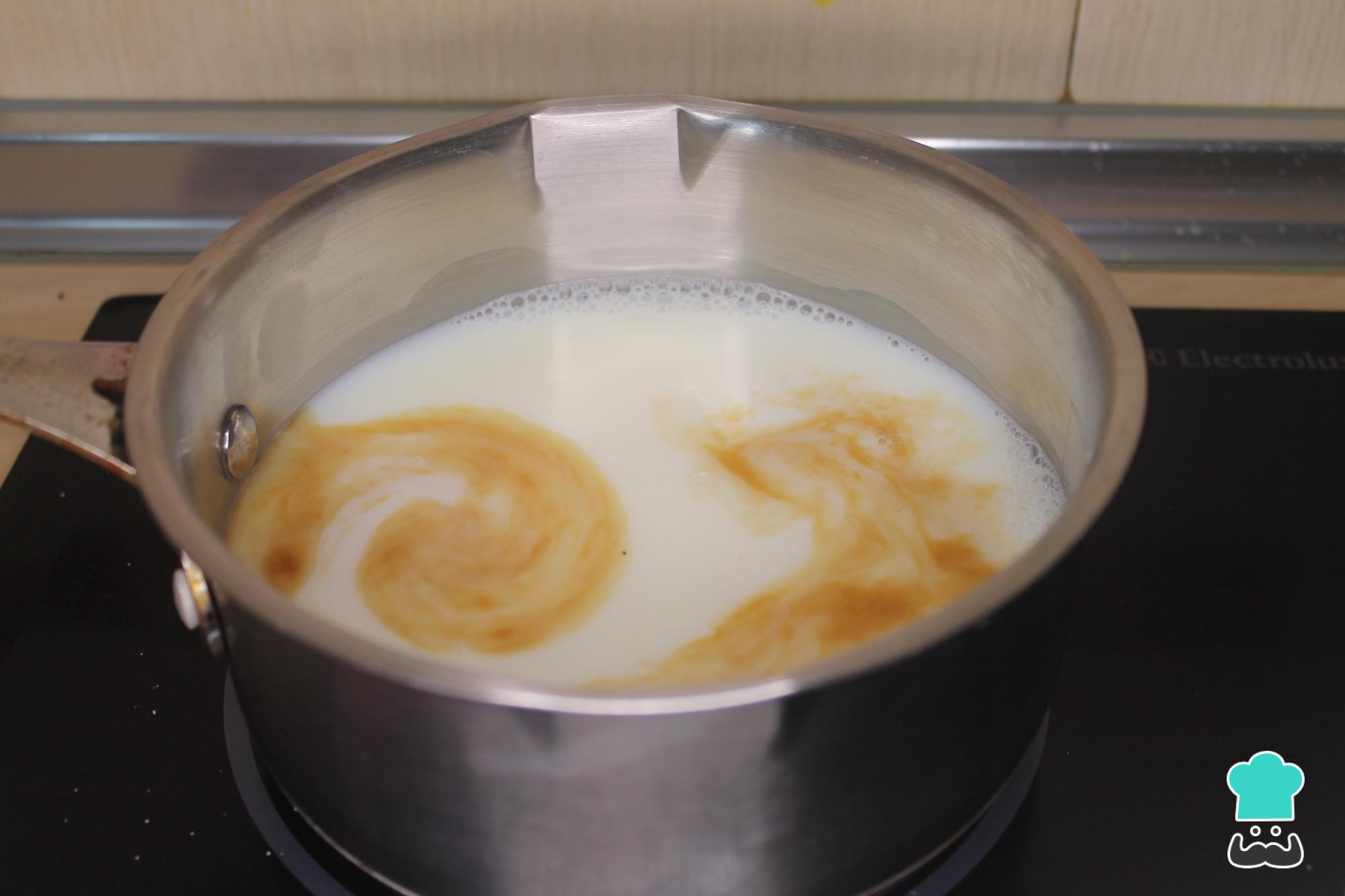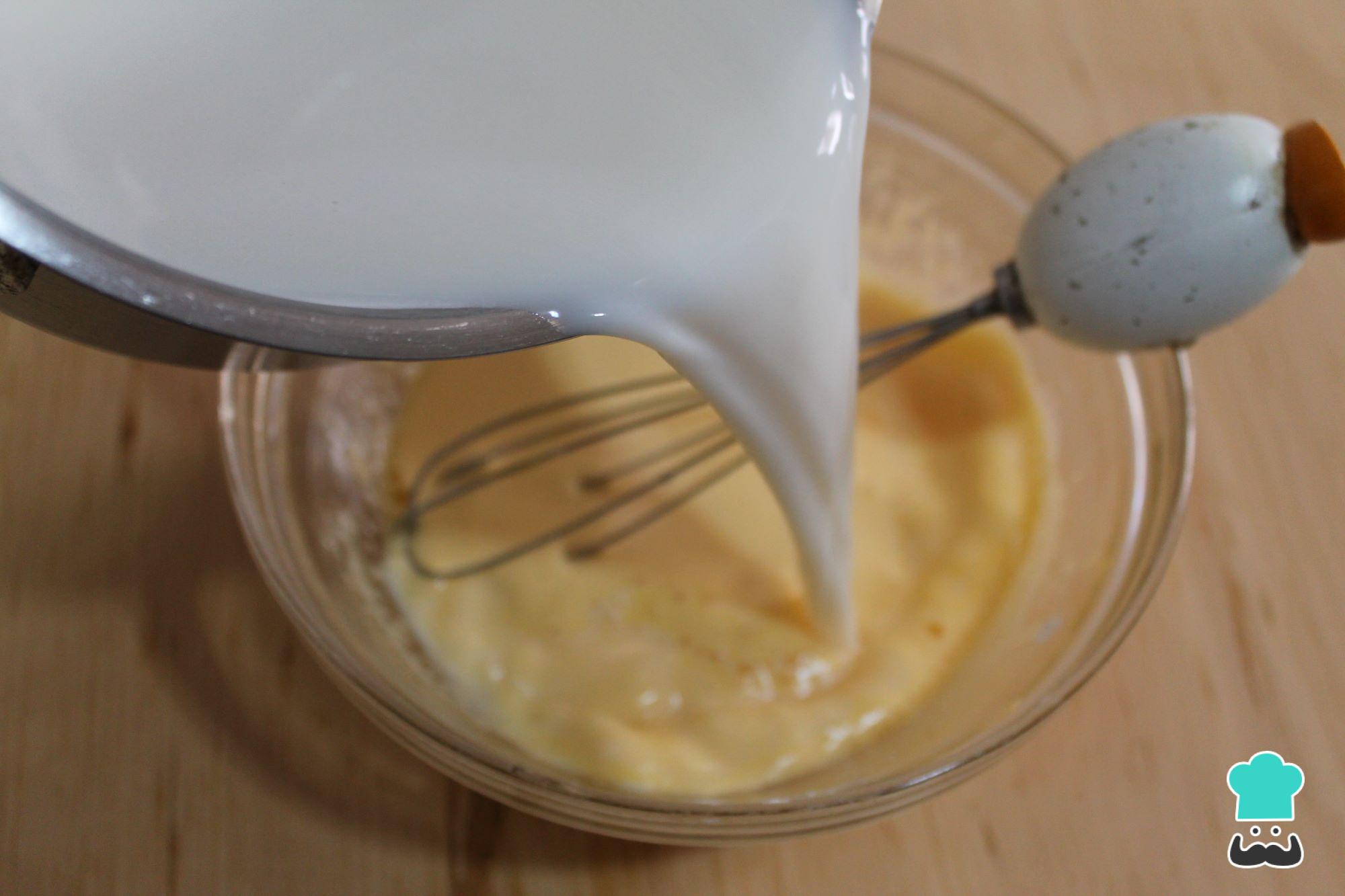 Cuando la leche esté caliente, pero sin que llegue a hervir, coge un pequeña cantidad de leche caliente y añade a las yemas mientras remueves seguidamente para que las yemas no se cuajen. Añade un poco más y, al final, toda la leche.