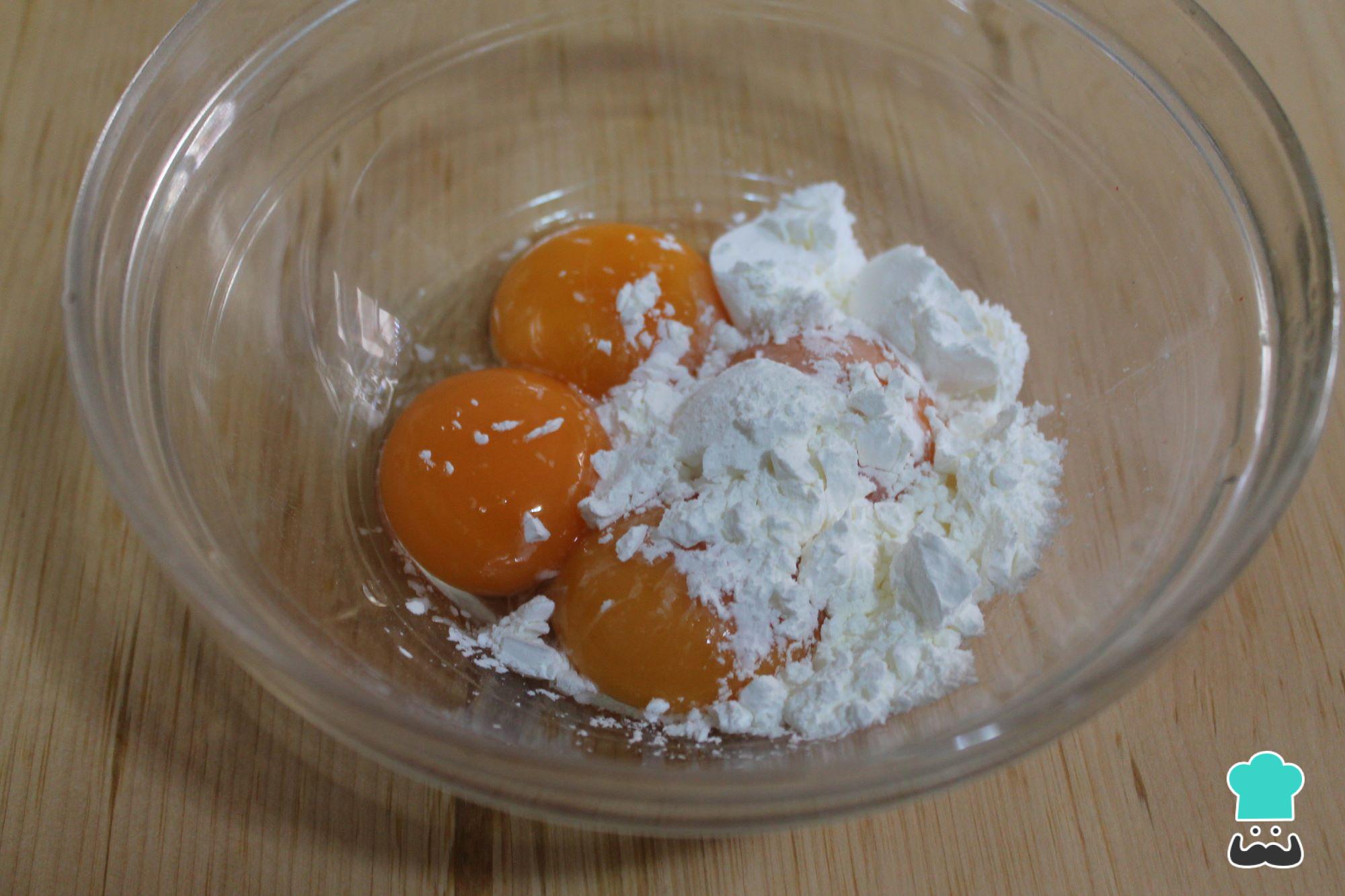 Mientras la leche con el azúcar se calienta, en un bol aparte añade las yemas de huevo y la maicena. Mezcla con unas varillas hasta deshacer cualquier posible grumo.