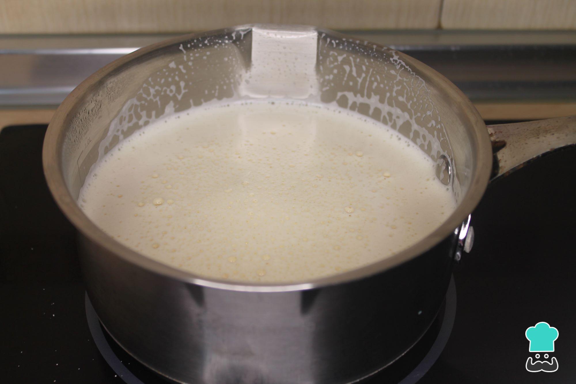 Una vez preparada la base, haz la crema pastelera. Pon en un cazo a fuego medio la leche junto con los 100 g de azúcar y la cucharadita de vainilla líquida.