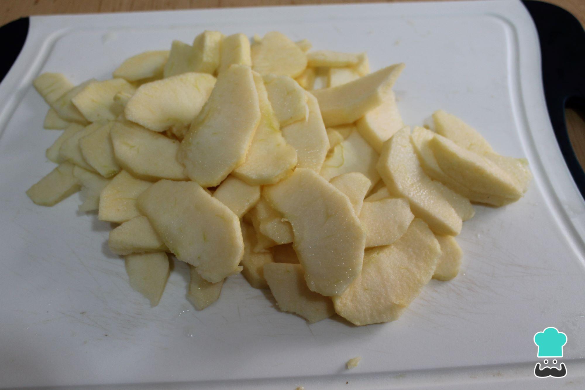 Mientras se hornea la plancha de hojaldre, descorazona las manzanas y pélalas. Corta en rodajas muy finas con un cuchillo afilado. Exprime unas gotas de zumo de limón por encima para que las rodajas de manzana no se oxiden.