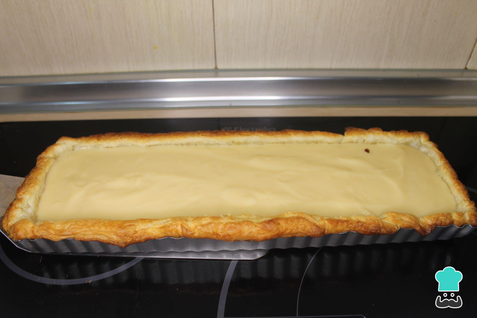 Una vez hayan pasado los 15 minutos de cocción de la plancha de hojaldre, retira del horno con cuidado de no quemarte y retira el papel de horno con las legumbres secas. Vierte la crema pastelera que teníamos reservada.