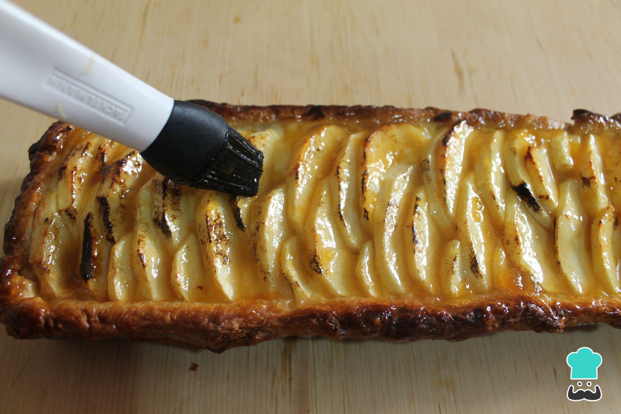 Una vez horneada la tarta de manzana con hojaldre y crema pastelera, pincela toda la superficie con la mermelada de albaricoque.