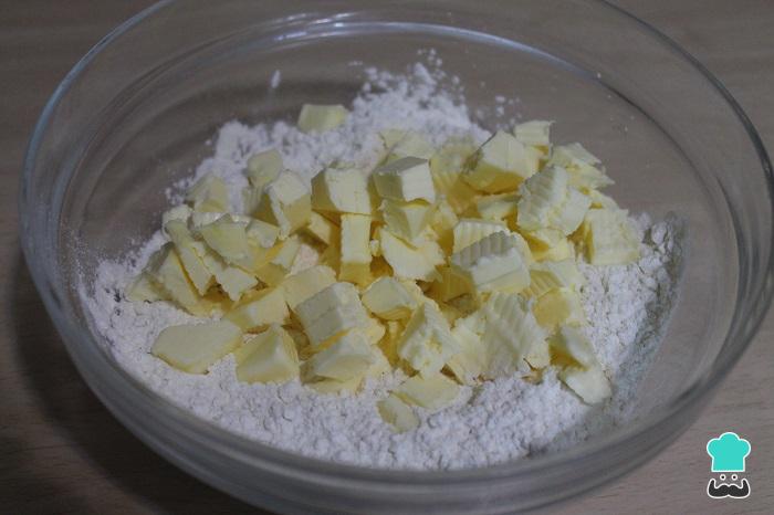 Preparamos primero la masa quebrada, para ello ponemos en un bol amplio la harina y la mantequilla cortada en trocitos. Amasar con las manos deshaciendo la mantequilla con la harina hasta conseguir un aspecto de migas de pan.