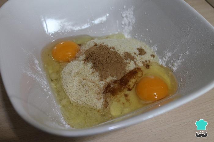 Mientras, prepararemos el relleno. En un bol poner los huevos junto con la maicena, la almendra molida, la panela o el azúcar moreno y la canela. Batir bien.