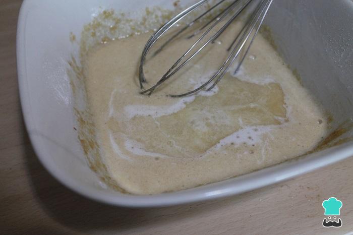 Verter encima de las manzanas la mezcla de huevos, nata y sidra. Remover bien el compuesto para que las manzanas queden bien impregnadas. Reservar.