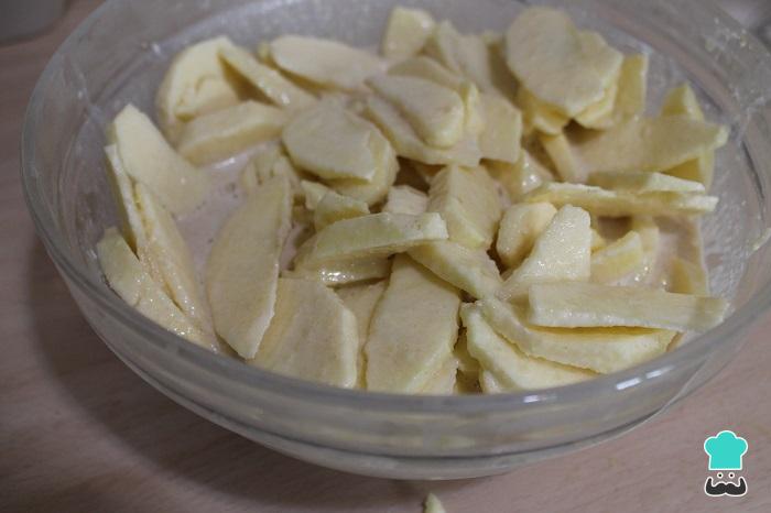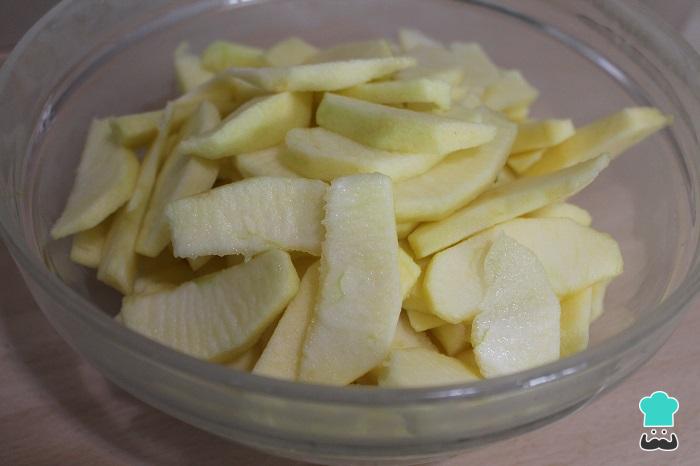 Descorazonar y pelar las manzanas. Partir por la mitad las manzanas y cortar en gajos finos.