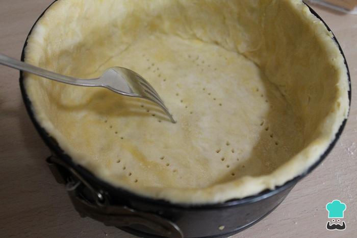 Precalentar el horno a 180 ºC. Sacar la masa quebrada de la nevera. Estirar con ayuda de un rodillo y forrar un molde desmontable de 20 cm de diámetro engrasado ligeramente con un poco de aceite o mantequilla. Retirar la masa restante del molde y pinchar el fondo con un tenedor.