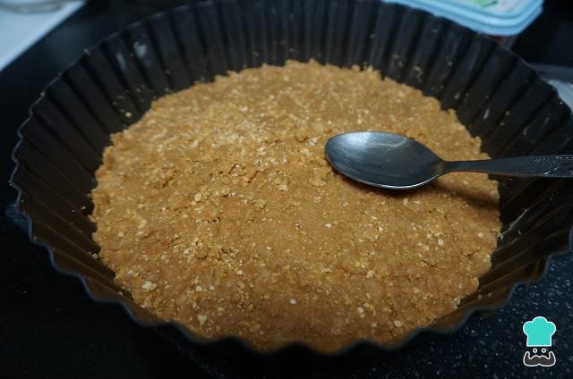 A continuación, cogeremos un molde para horno y lo untaremos de mantequilla. Colocaremos una base en el fondo del molde con las galletas haciendo un poco de presión con ayuda de una cuchara para que nos quede bien prensada.