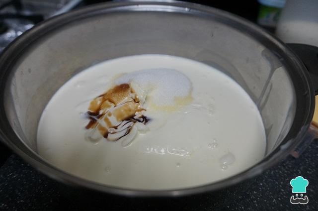 Ahora preparamos la crema de queso. En un cazo ponemos la nata, el queso el azúcar, la leche condensada y la cucharada de esencia de vainilla. Lo pondremos a calentar al fuego medio, iremos removiendo.