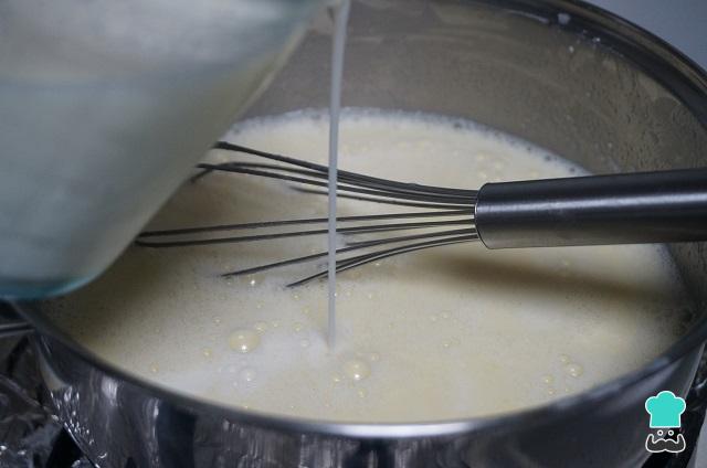 Cuando empiece a hervir la mezcla que tenemos al fuego iremos echando el vaso con la leche y la cuajada disuelta, iremos removiendo.