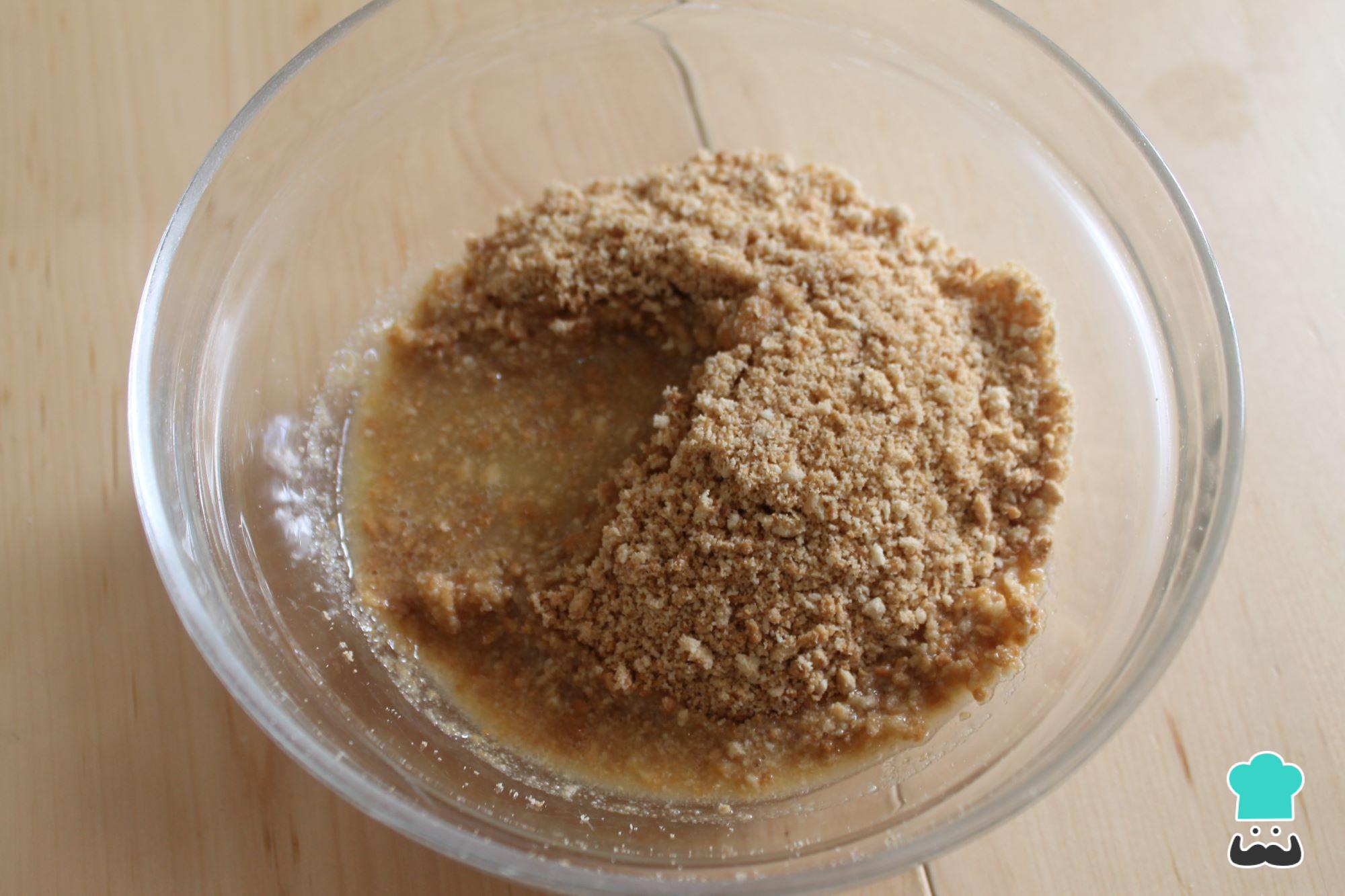 Para empezar con la receta de la tarta de petit suisse sin horno, en primer lugar prepara la base. Para ello, tritura las galletas para que quede un polvo fino. Y, si no tienes picadora, puedes hacerlo introduciendo las galletas en una bolsa y pasando por encima un rodillo de cocina. A continuación, funde la mantequilla en el microondas y mezcla con las galletas trituradas.