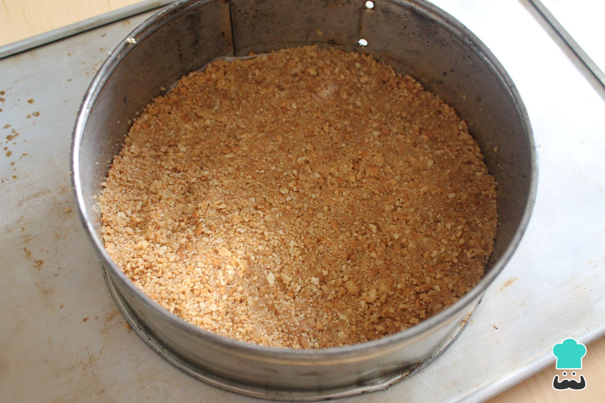 Engrasa un molde desmontable o un aro de repostería de unos 19 cm de diámetro y añade la mezcla de galletas con mantequilla, acomoda bien en el fondo apretando con las manos o con una cuchara. Reserva en la nevera.