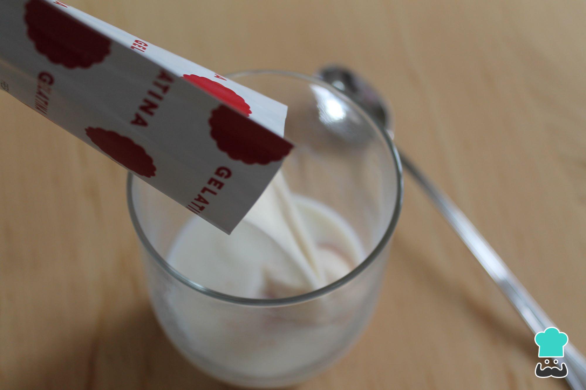 A continuación, prepara el relleno de la tarta petit suisse con gelatina. Para ello, calienta en el microondas la mitad de la leche aproximadamente. No hace falta que hierva. Seguido, vierte el sobre de gelatina de fresa en la leche y disuelve bien, no debe quedar ningún grumo.