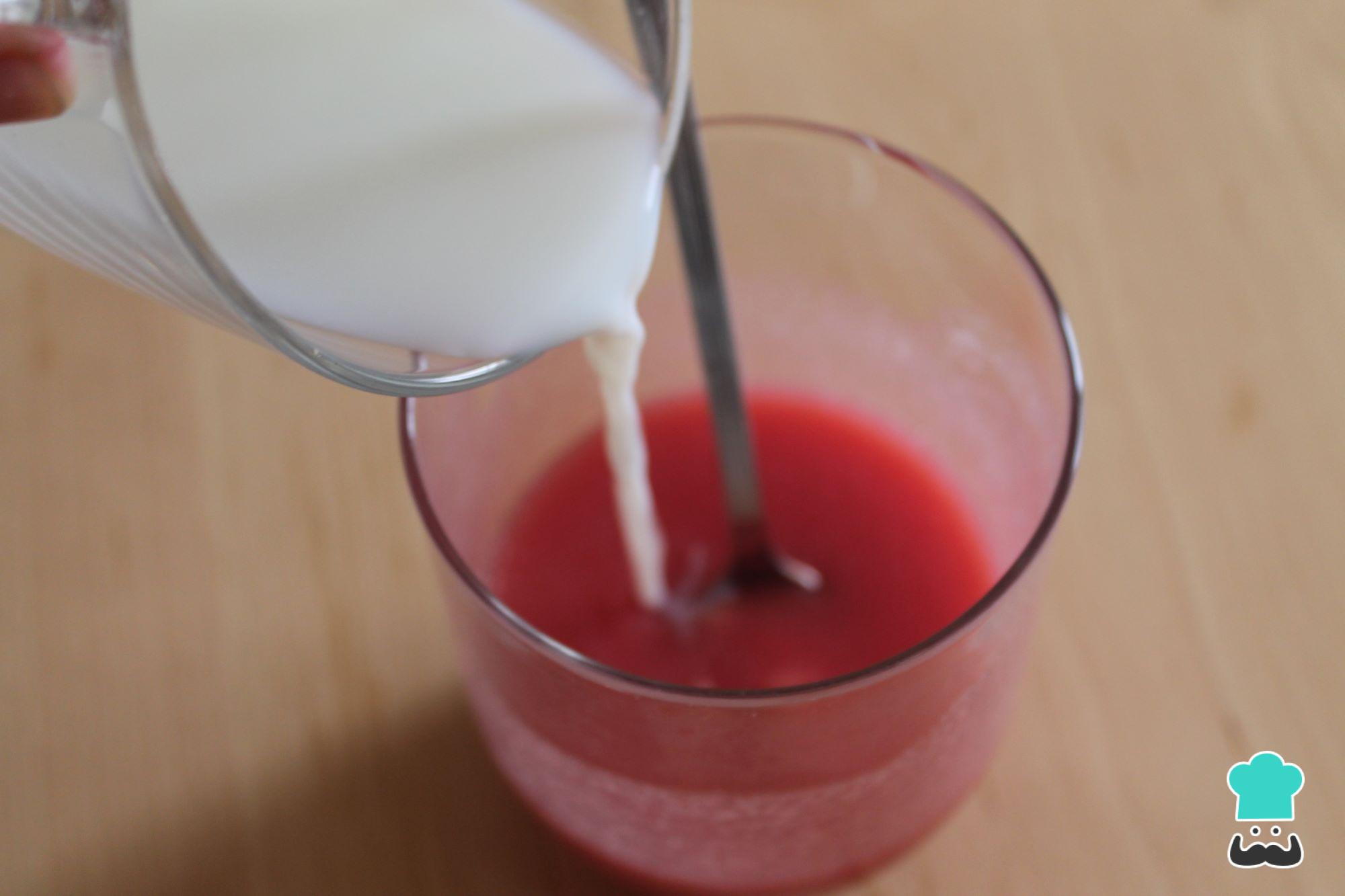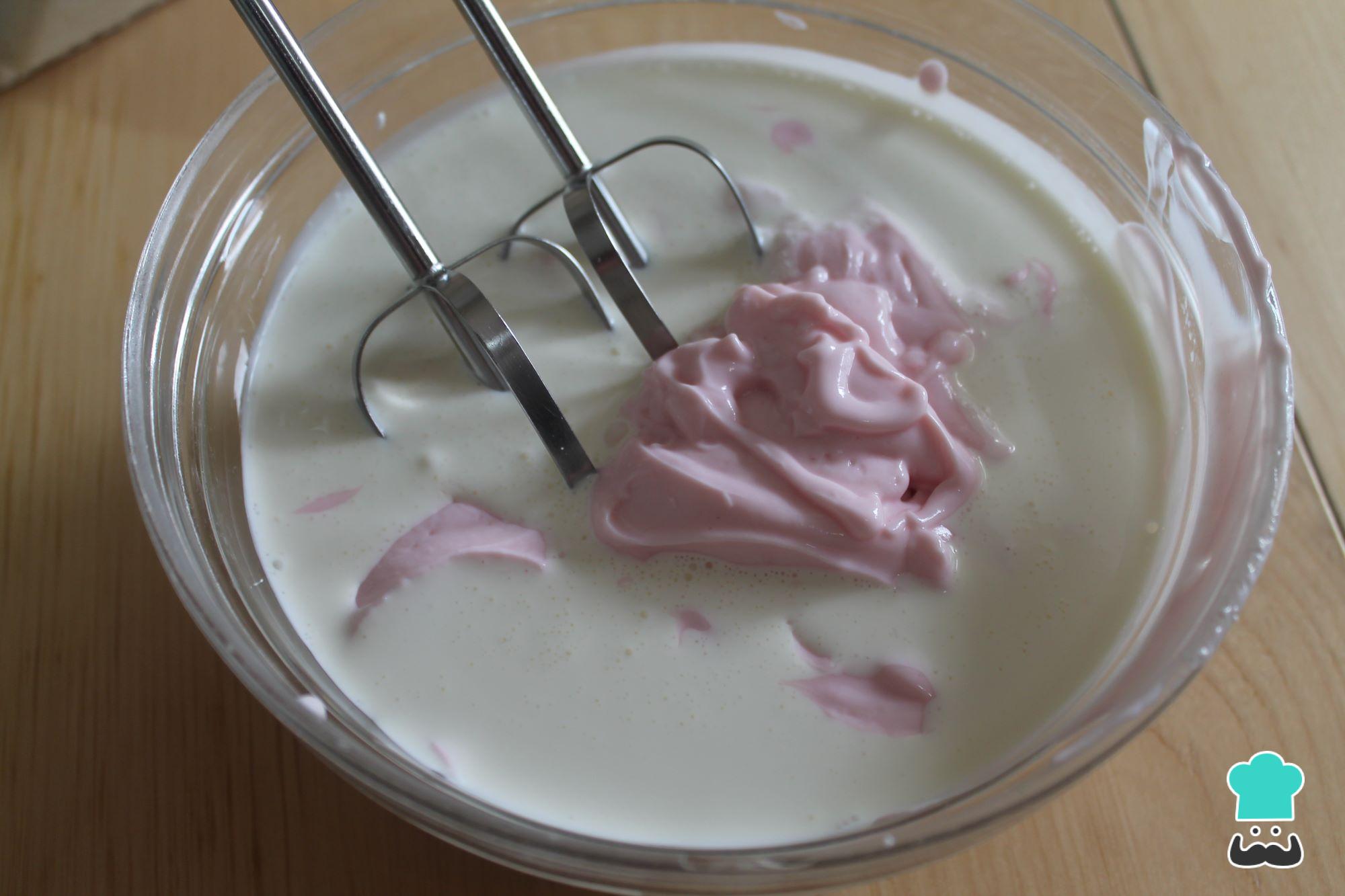 Incorpora la gelatina de fresa disuelta en la leche y mezcla, esta vez debes hacerlo con unas varillas manuales hasta integrar todo bien.