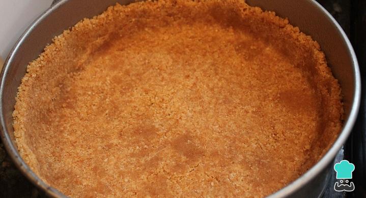 Teniendo esto listo, empezamos por hacer la base para la tarta de queso. Para ello, coge las galletas y tritúralas con la batidora hasta que queden bien finas, casi hechas polvo. Añade la mantequilla blanda y mezcla bien hasta que consigas una masa homogénea y uniforme.