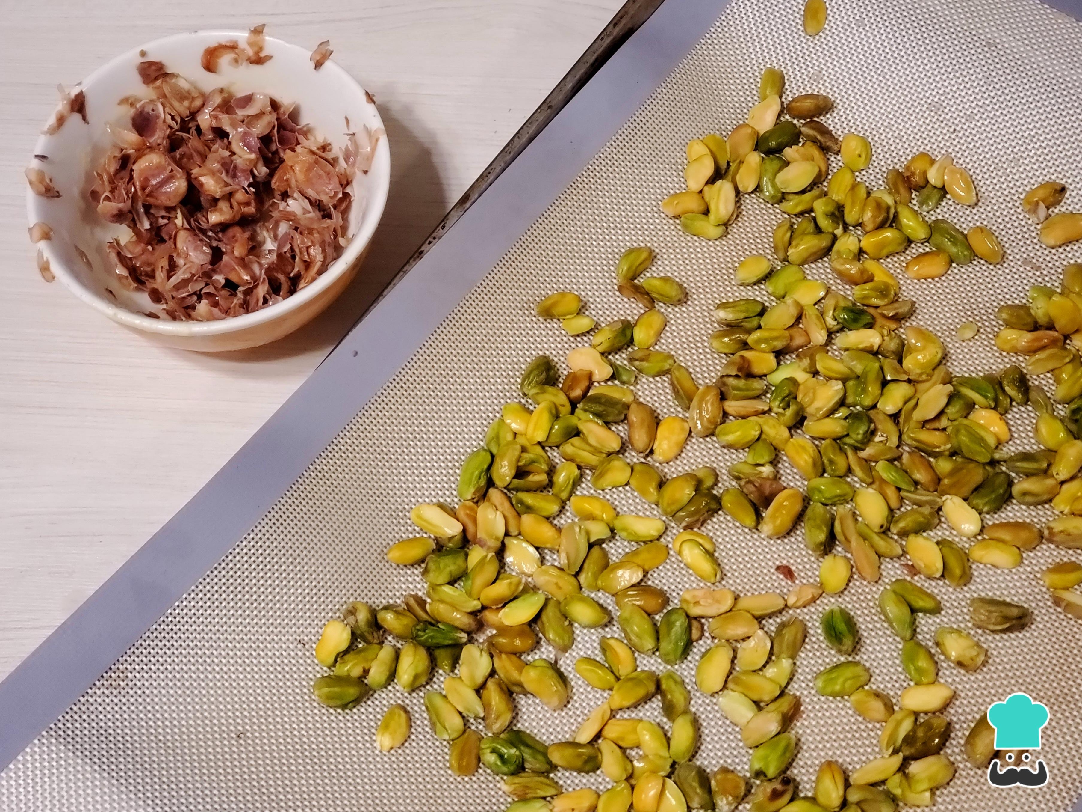 Cuando hayas pelado todos los pistachos, colócalos sobre una placa y hornéalos a 100 °C hasta que estén crujientes. No subas la temperatura porque se dorarán y ya no tendrán un color brillante.