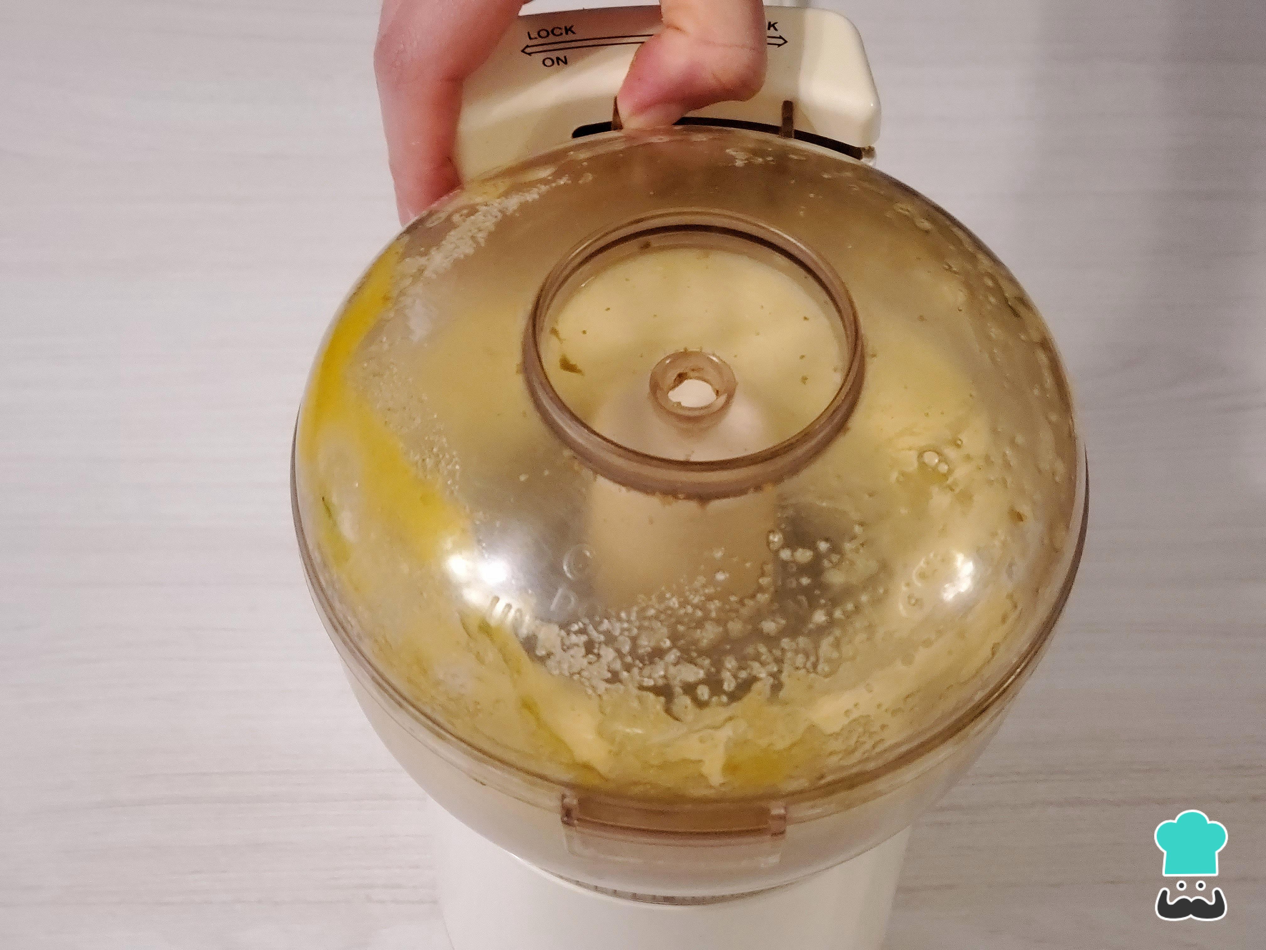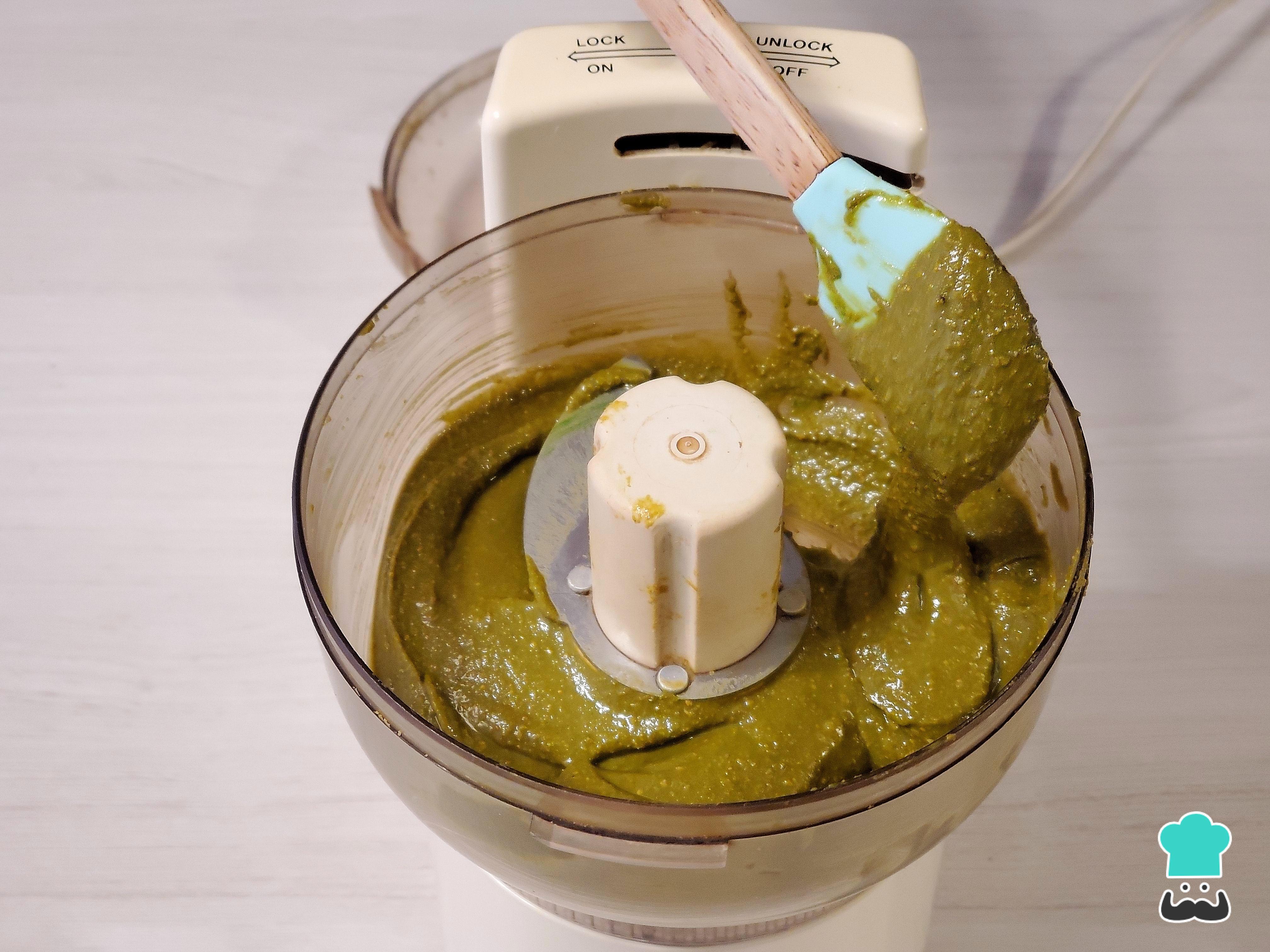 Procésalos hasta obtener una pasta suave. En este momento puedes agregar gotas de colorante vegetal si deseas un color verde más brillante. Reserva aparte.