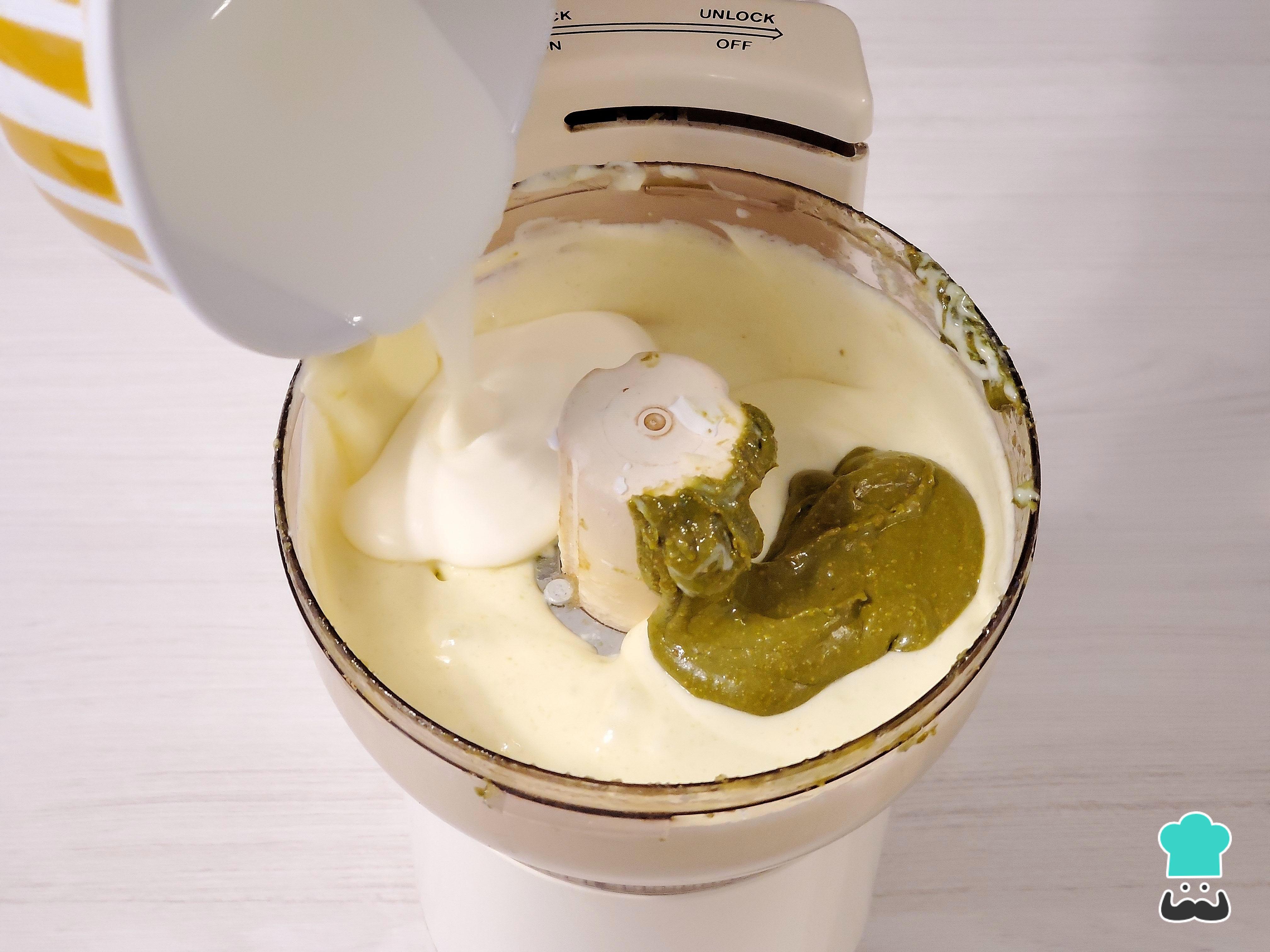 Tritura hasta tener una crema sin grumos, añade la pasta de pistachos y la crema de leche.