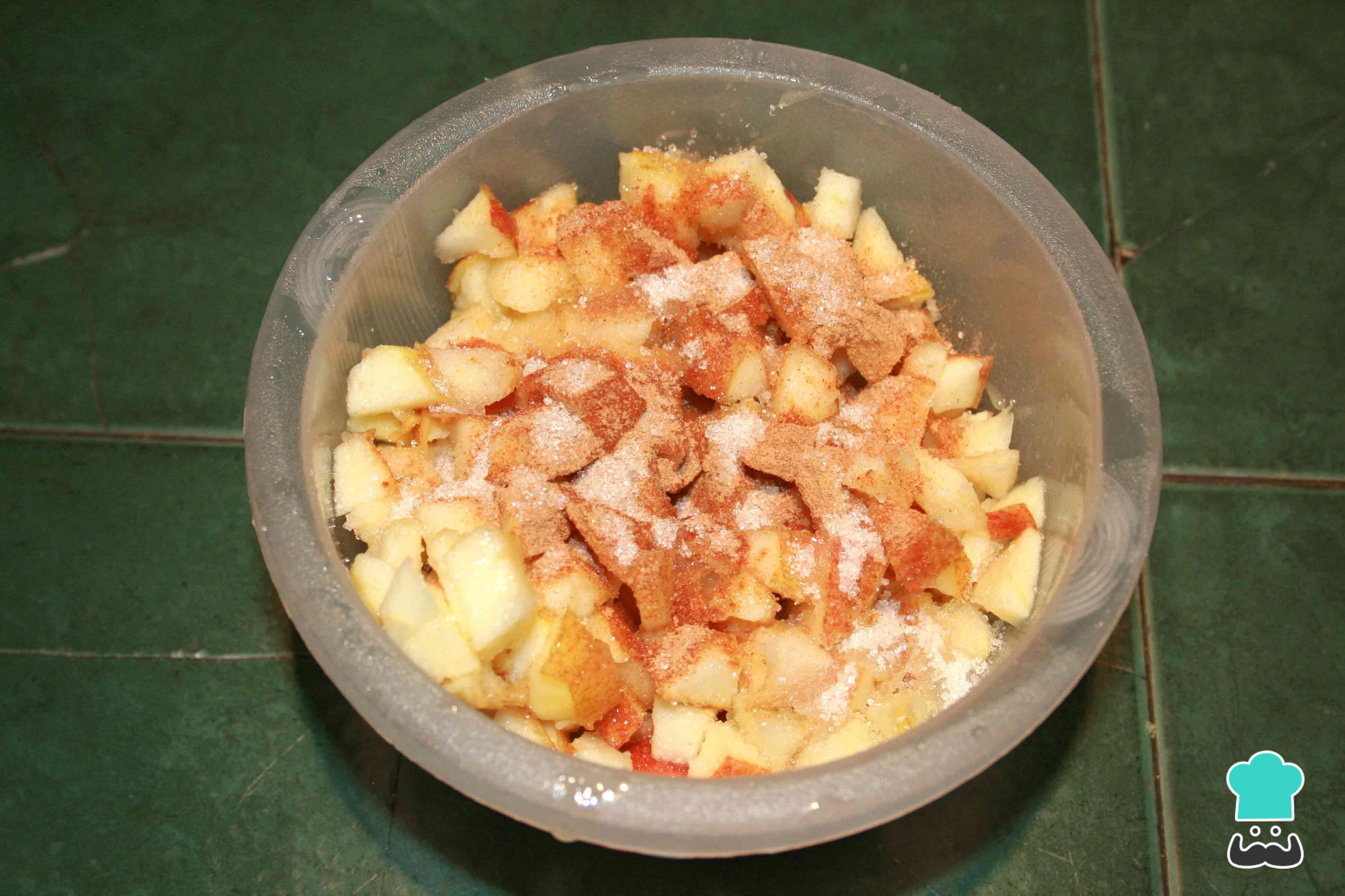 Dentro de un bol, coloca las manzanas en cubos. Agrega el azúcar, el limón y la canela al gusto. Mezcla bien.