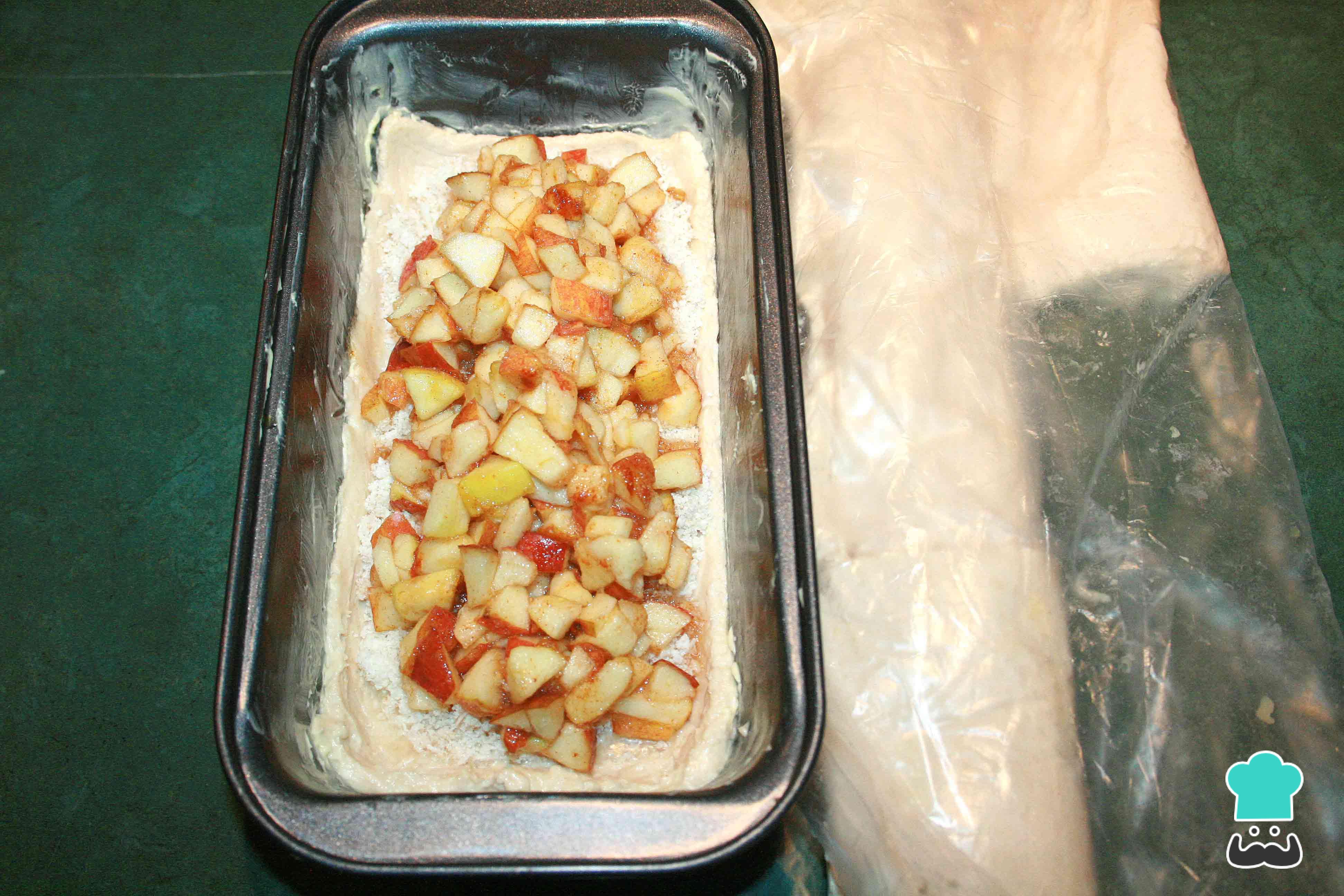 Vierte sobre el requesón los cubos de manzana. Extiéndelos sin tocar los limites de los bordes, para que luego sea fácil sellar el hojaldre con requesón.