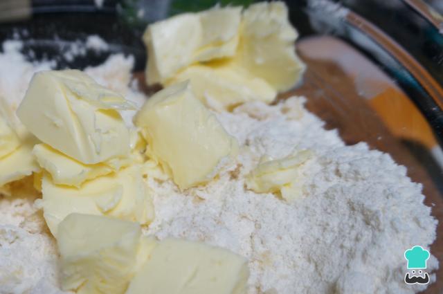 Empieza preparando la masa para la base. Así, en un bol mezcla el azúcar con la harina, la mantequilla a temperatura ambiente, la esencia de vainilla y un huevo. Con ayuda de una espátula o con tus propias manos, mezcla hasta que quede como una arenilla, entonces añade la leche e intégrala sin amasar mucho.