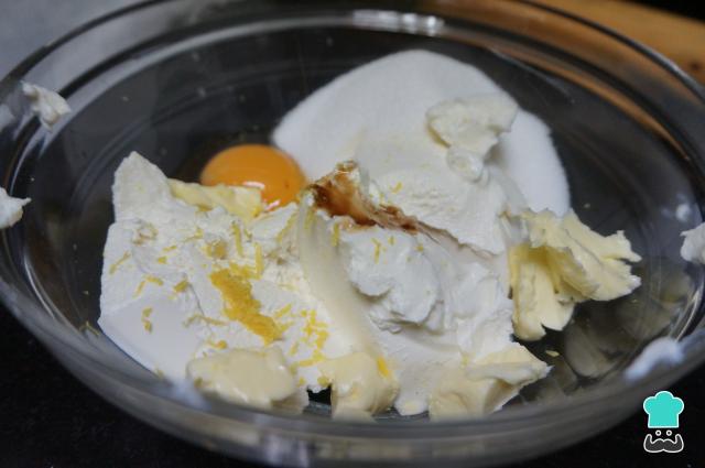 En otro bol pon el queso, la vainilla, el huevo, la ralladura de limón y la mantequilla. Mezcla todo bien hasta que quede una masa lisa.