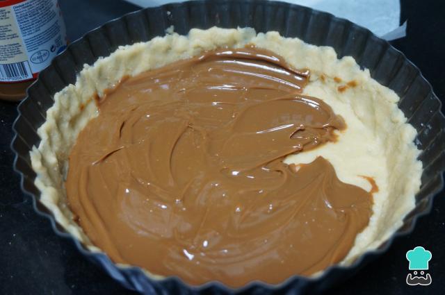 Saca el molde con la masa, cubre el fondo con dulce de leche a tu gusto, aunque te recomendamos añadir una capa generosa para notar bien su sabor. Aprovecha y prepara dulce de leche casero.