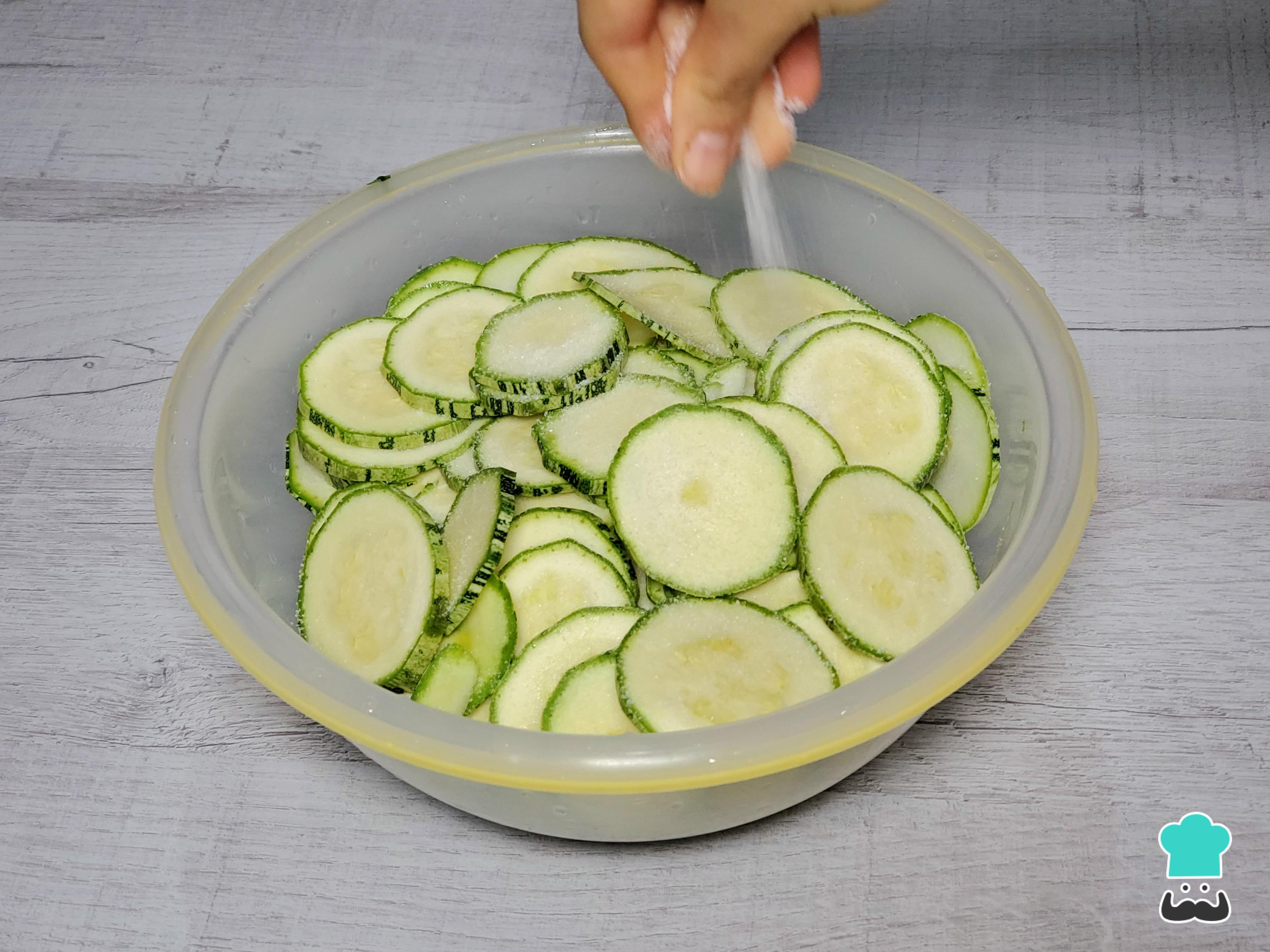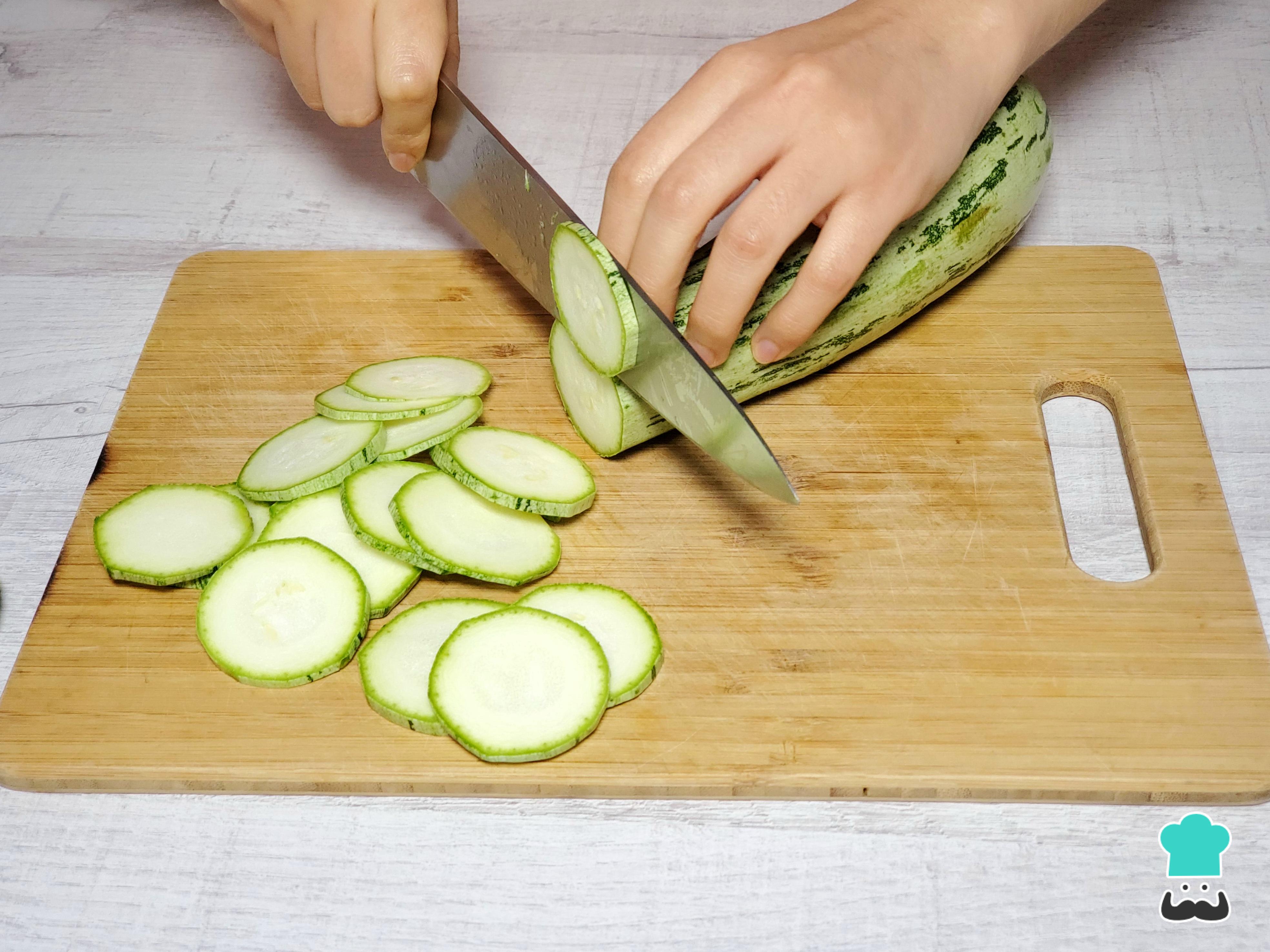 Empieza cortando los zucchinis en rodajas delgadas, de aproximadamente medio centímetro de grosor. No hace falta pelarlos ni quitarles las semillas, ya que durante la cocción se suavizan.