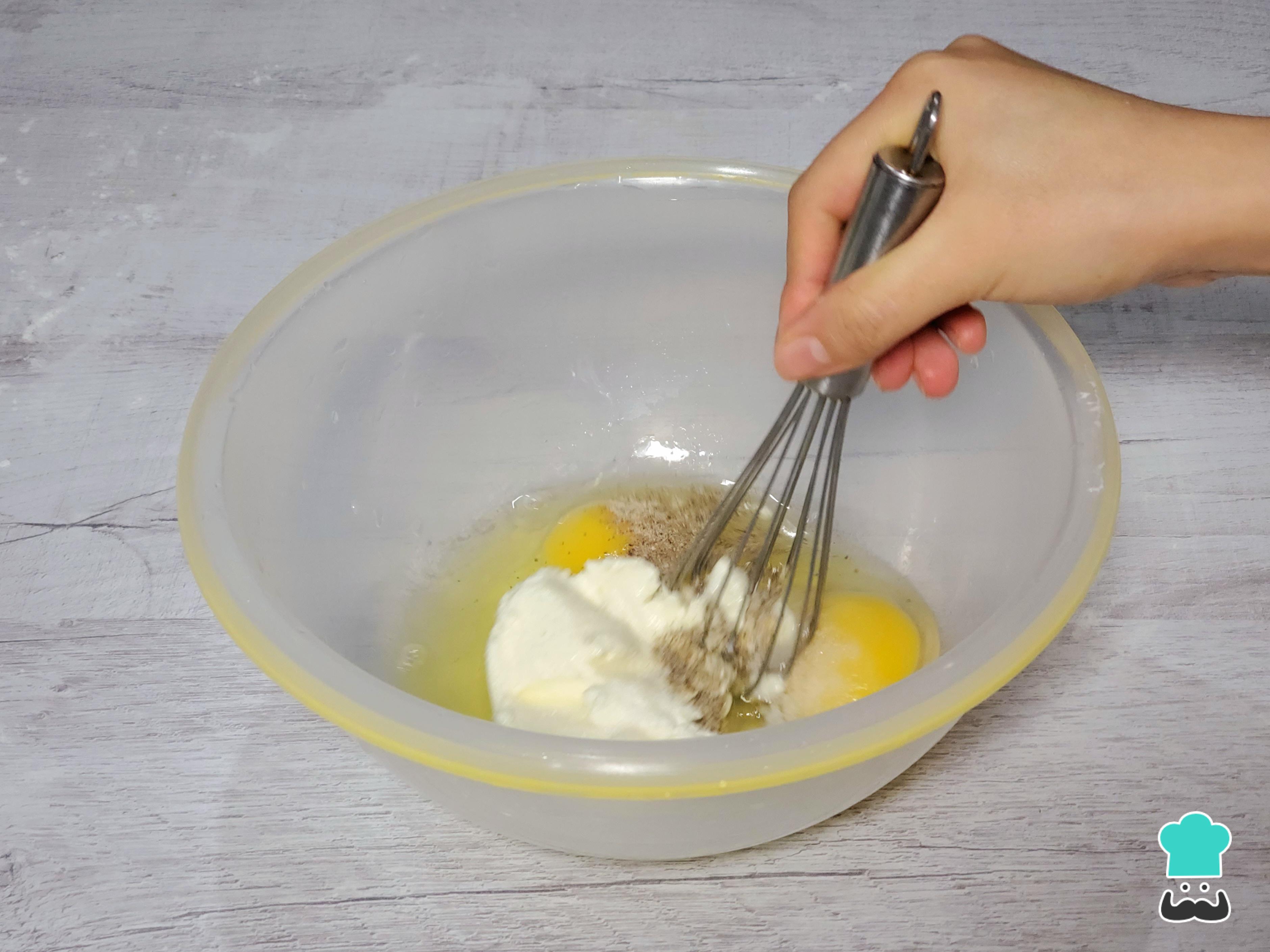 Mientras, en otro bowl, coloca los huevos, el queso ricotta o, si prefieres, queso crema, junto con una cucharadita de sal, pimienta negra molida y nuez moscada. Mezcla bien con un batidor de globo hasta obtener una crema homogénea.
