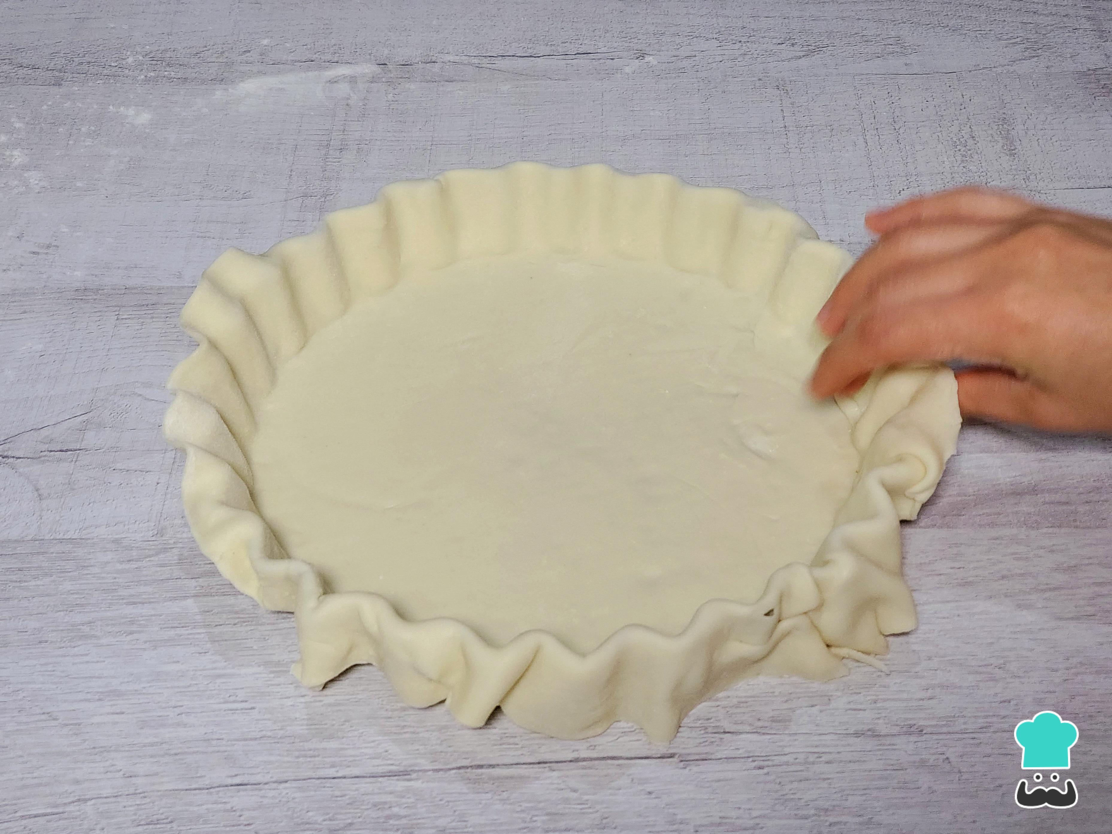 Extiende un disco de masa hojaldrada sobre una superficie ligeramente enharinada y espolvorea un poco más de harina encima, estira con suavidad. Acomoda la masa dentro del molde, adaptándola bien a los bordes y ángulos; cuando la veas bien, recorta el exceso.