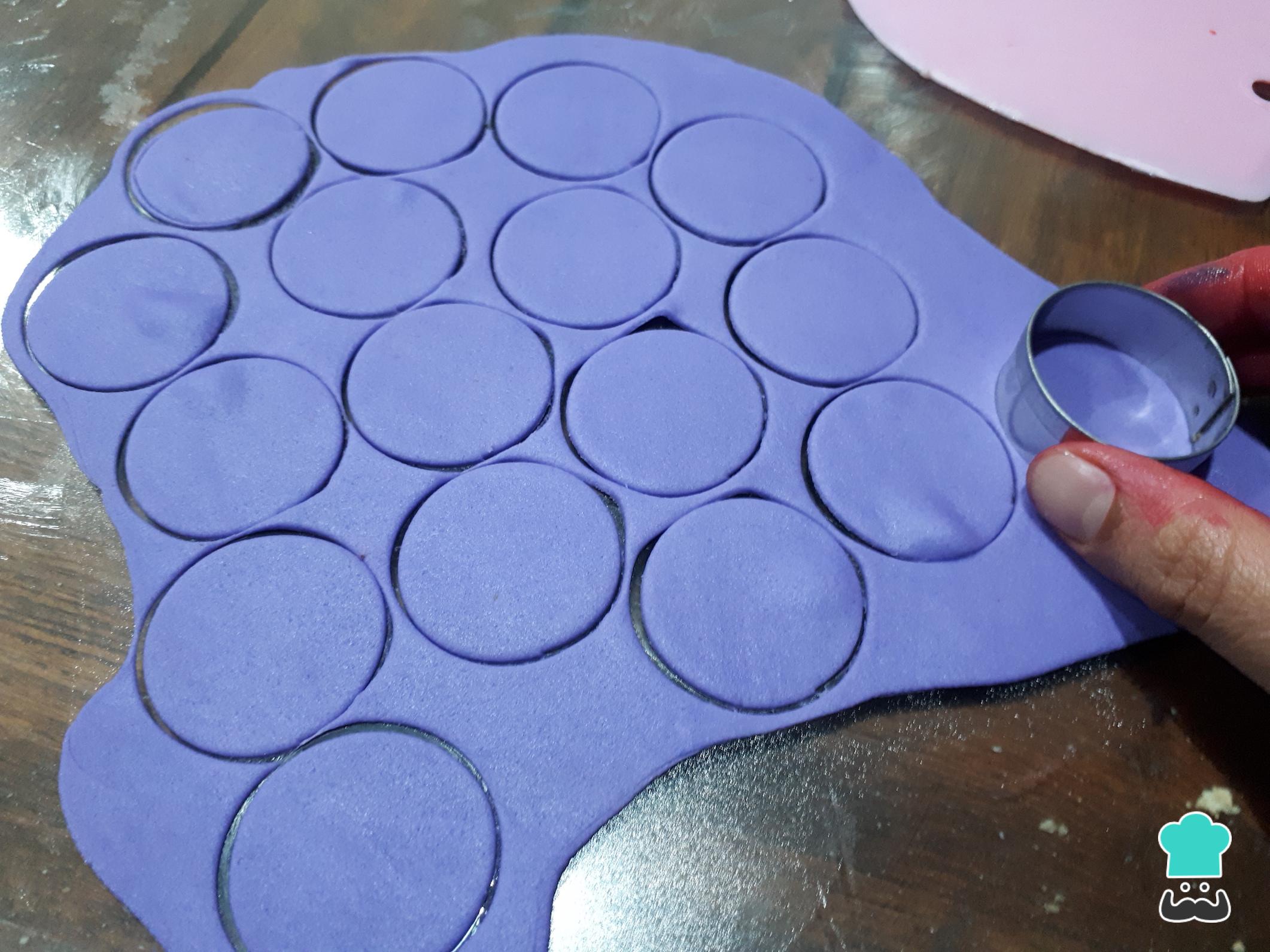 Estira un poco de fondant (puede ser blanco o de los colores que desees), y corta varios círculos. Con estos formaremos las flores de la torta decorada para el Día de la Madre.